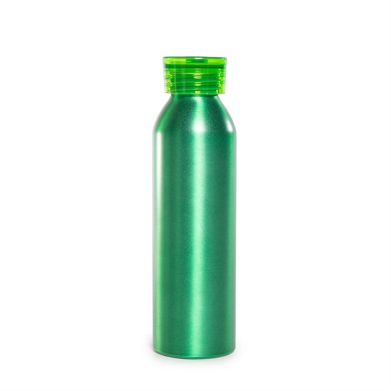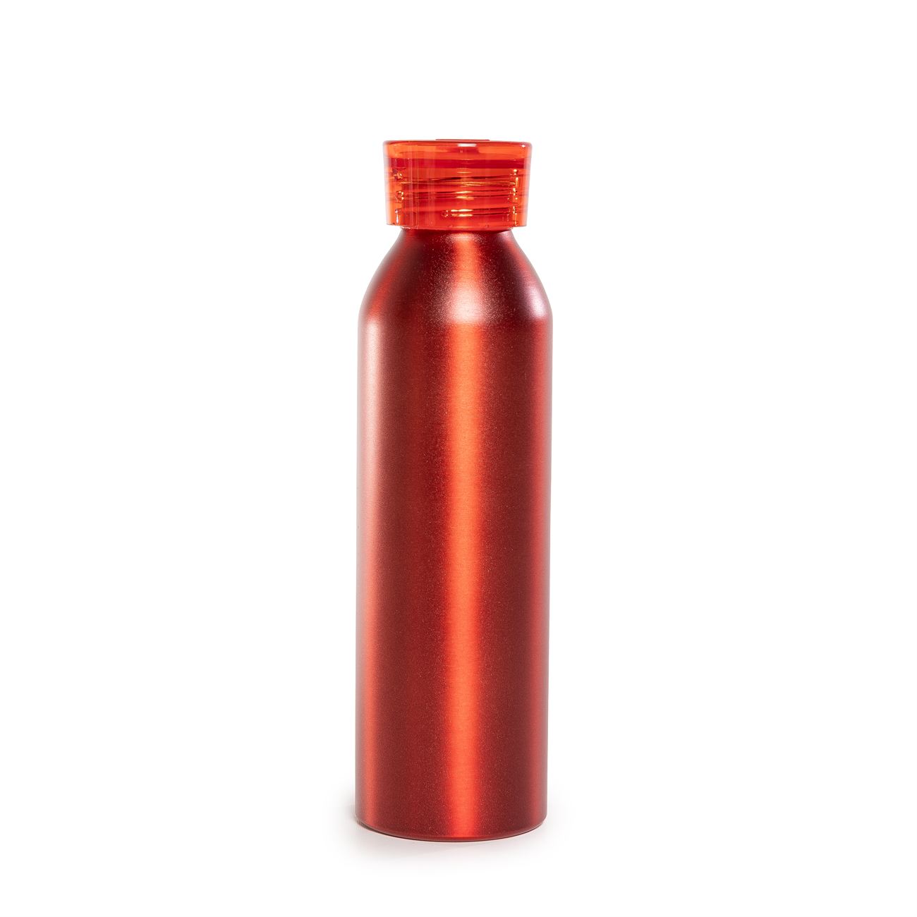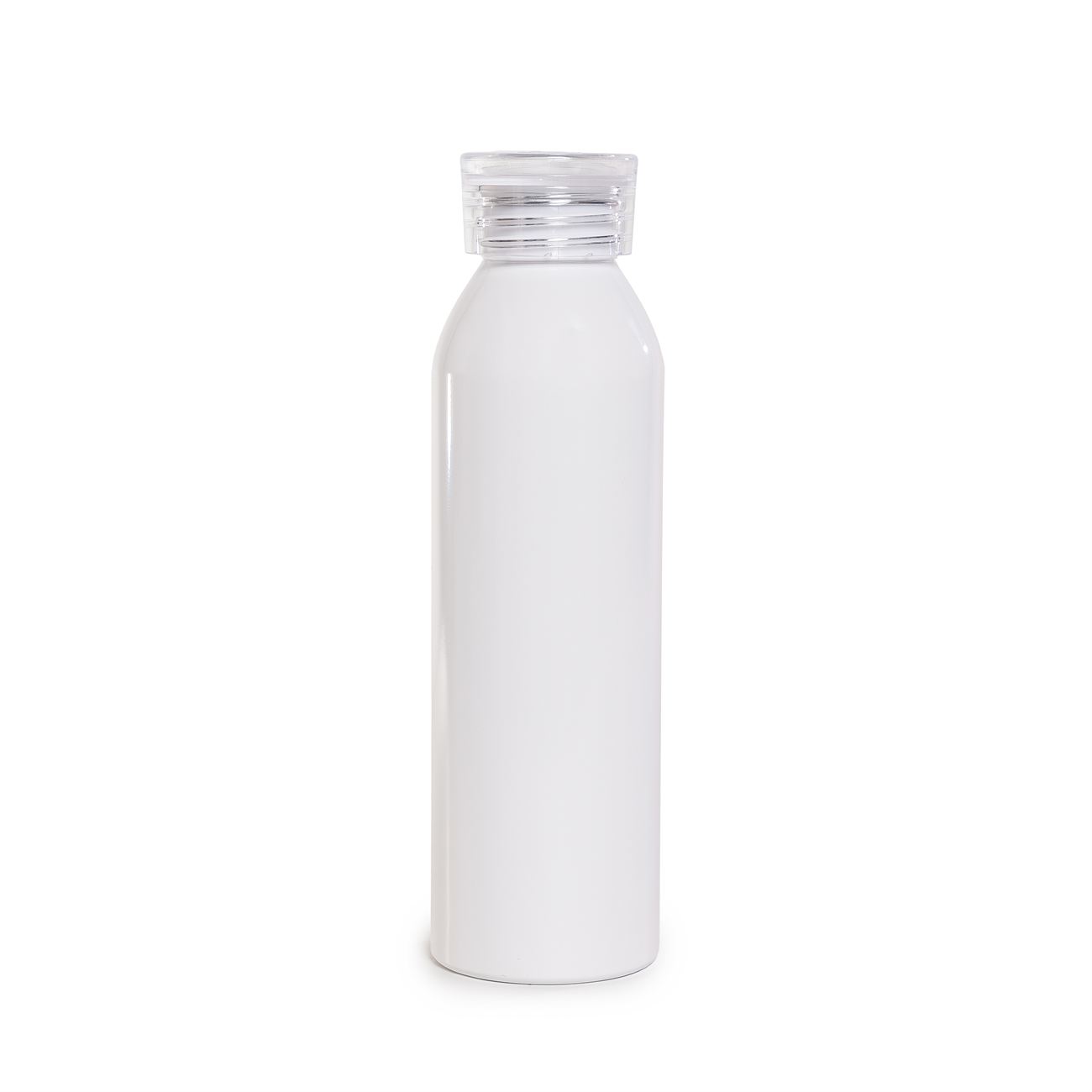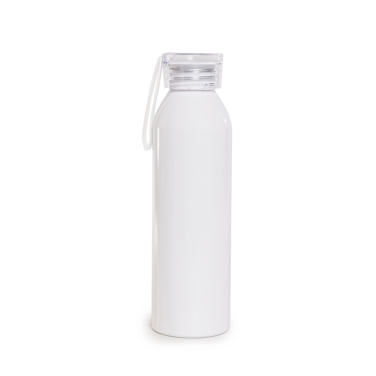 Botella de aluminio de 600ml pared simple. Tapa transparente a rosca con tira de agarre de silicona de 8 cm. Incluye caja de cartón blanca.
