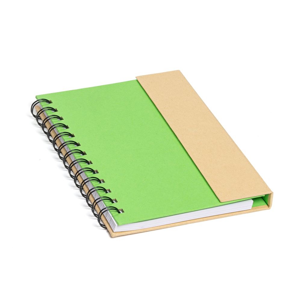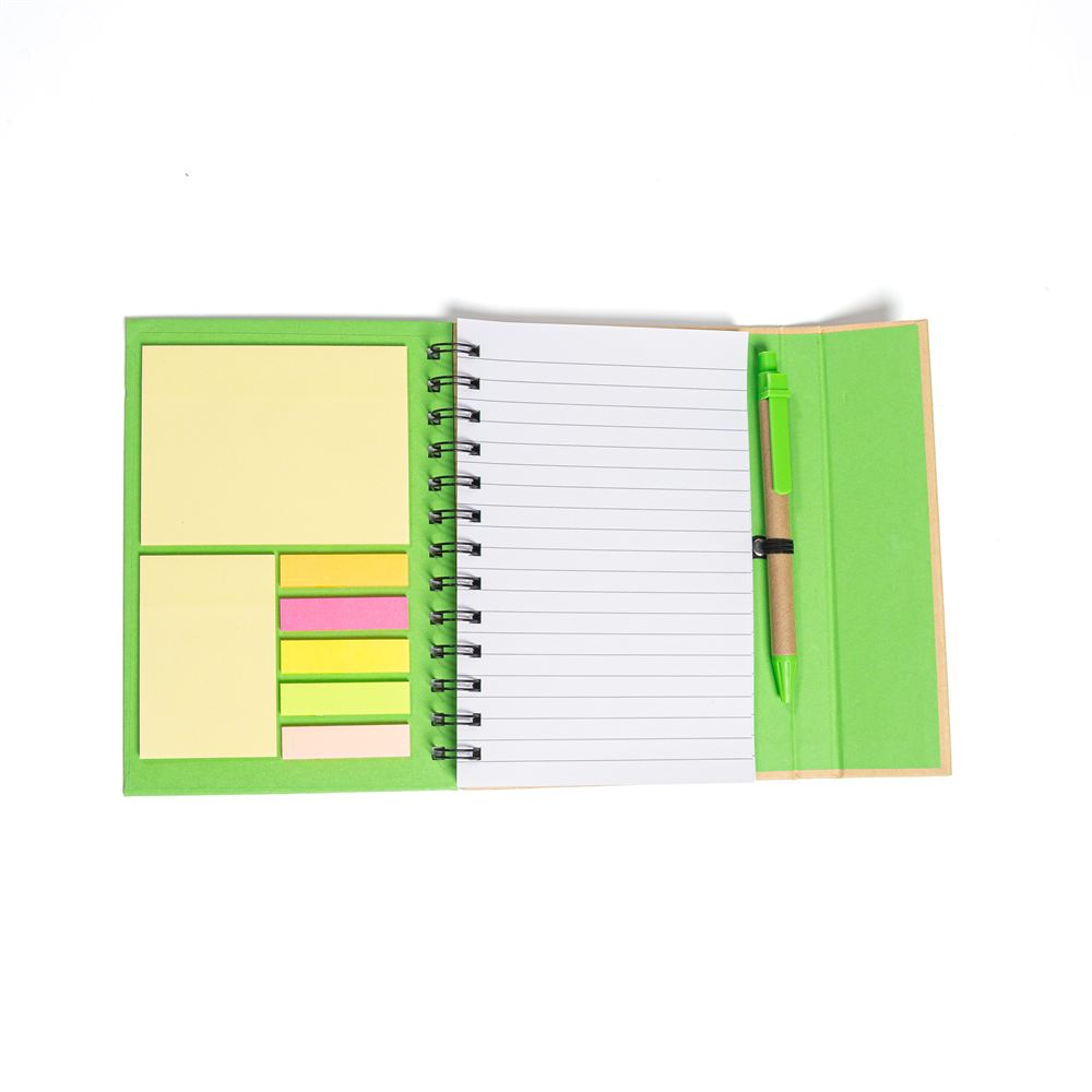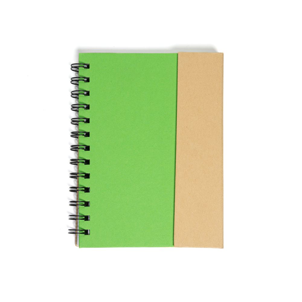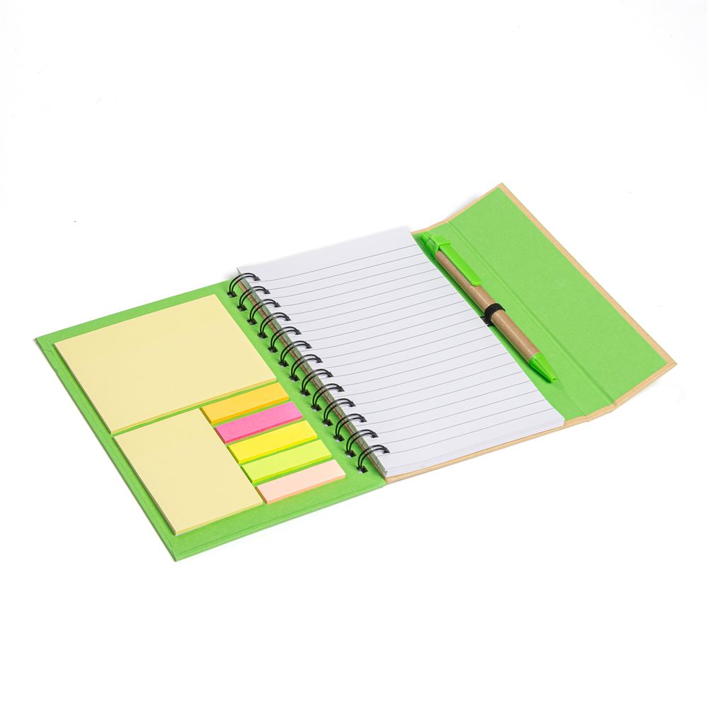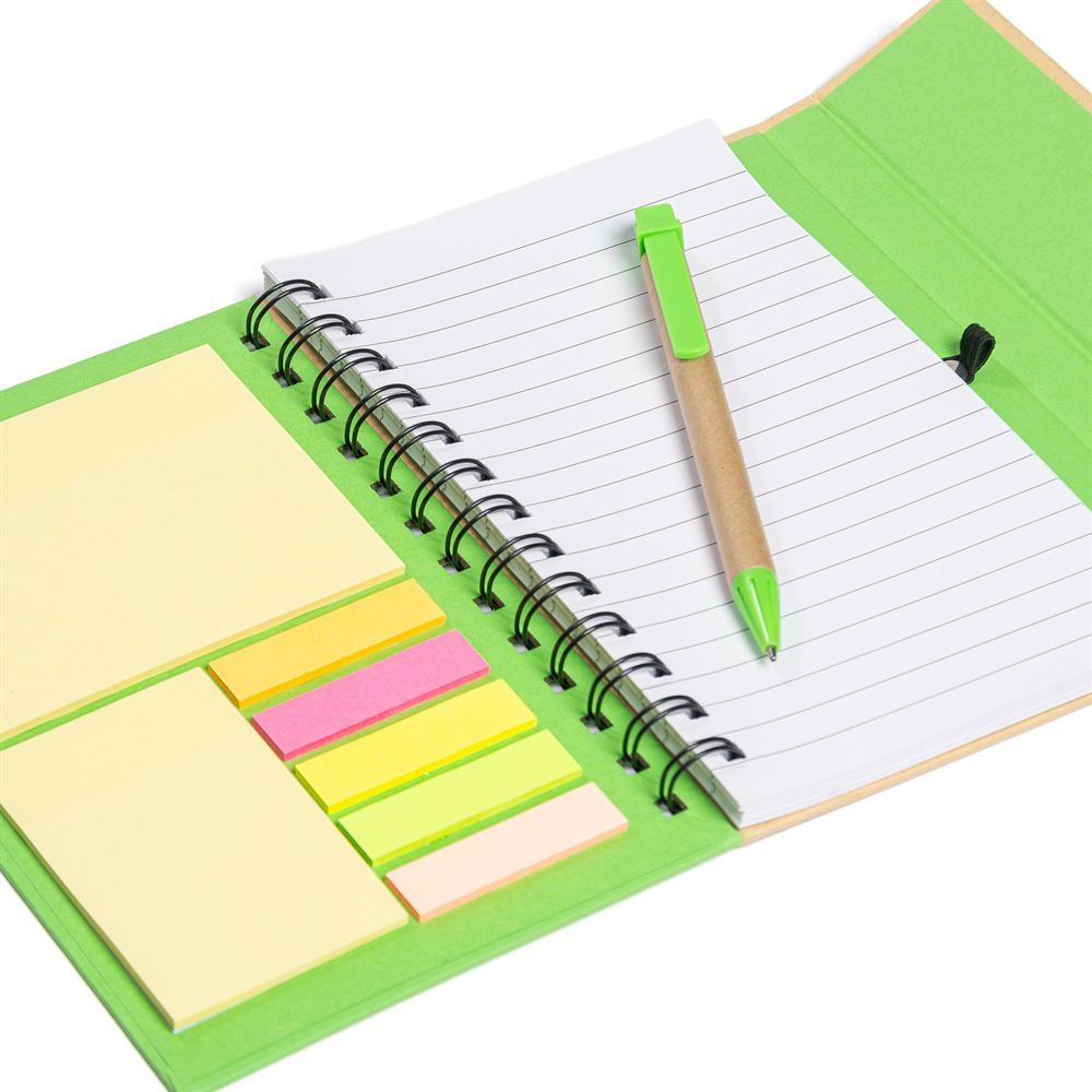 Descripción: Cuaderno ecológico espiralado, provee un bolígrafo ecológico de 14cm, block rayado de 70 hojas, en la tapa frontal un post-it de 10cm x 7,5cm, otro de 5cm x 7,5cm y 5 set de marcadores autoadhesivos. Tapa con cierre imantado.