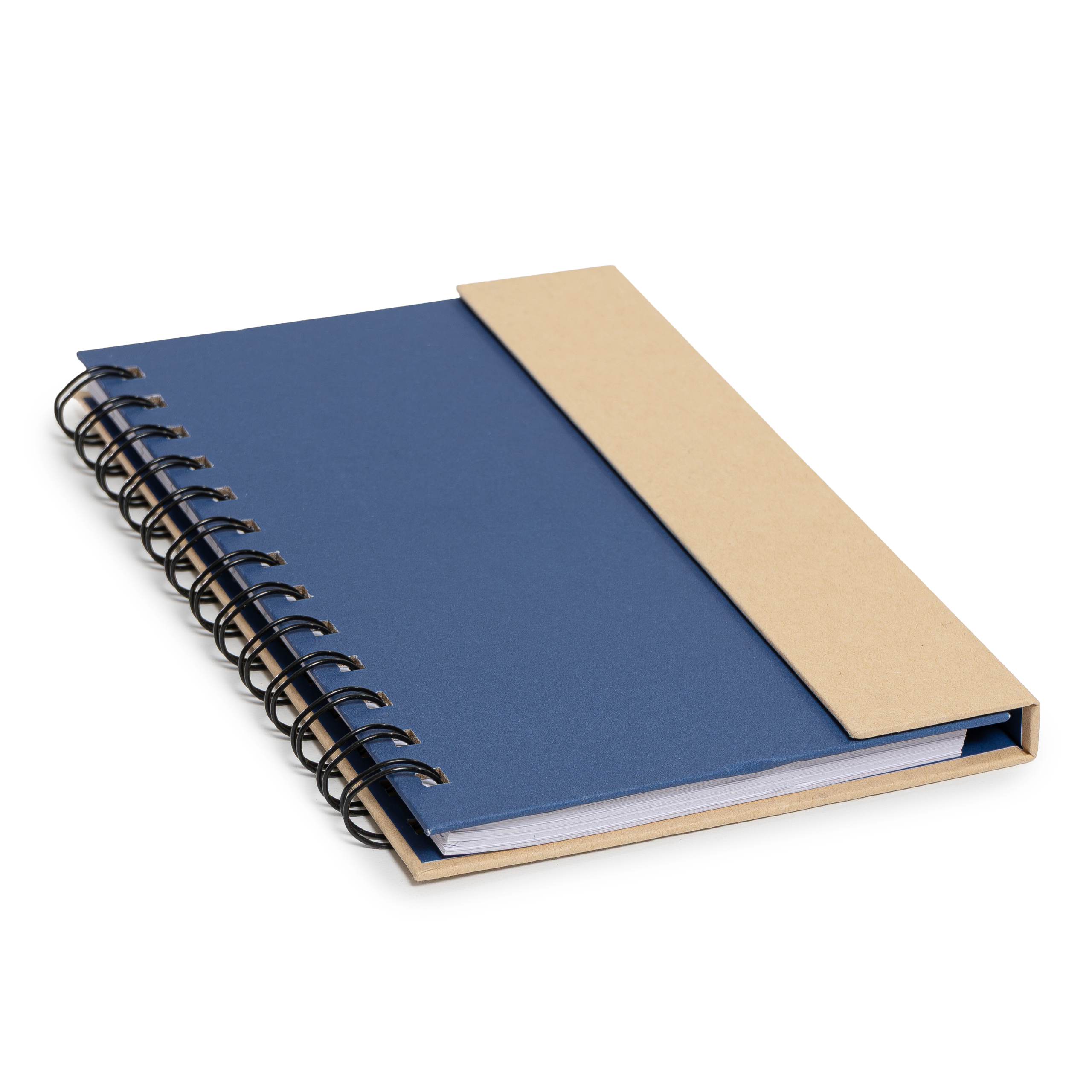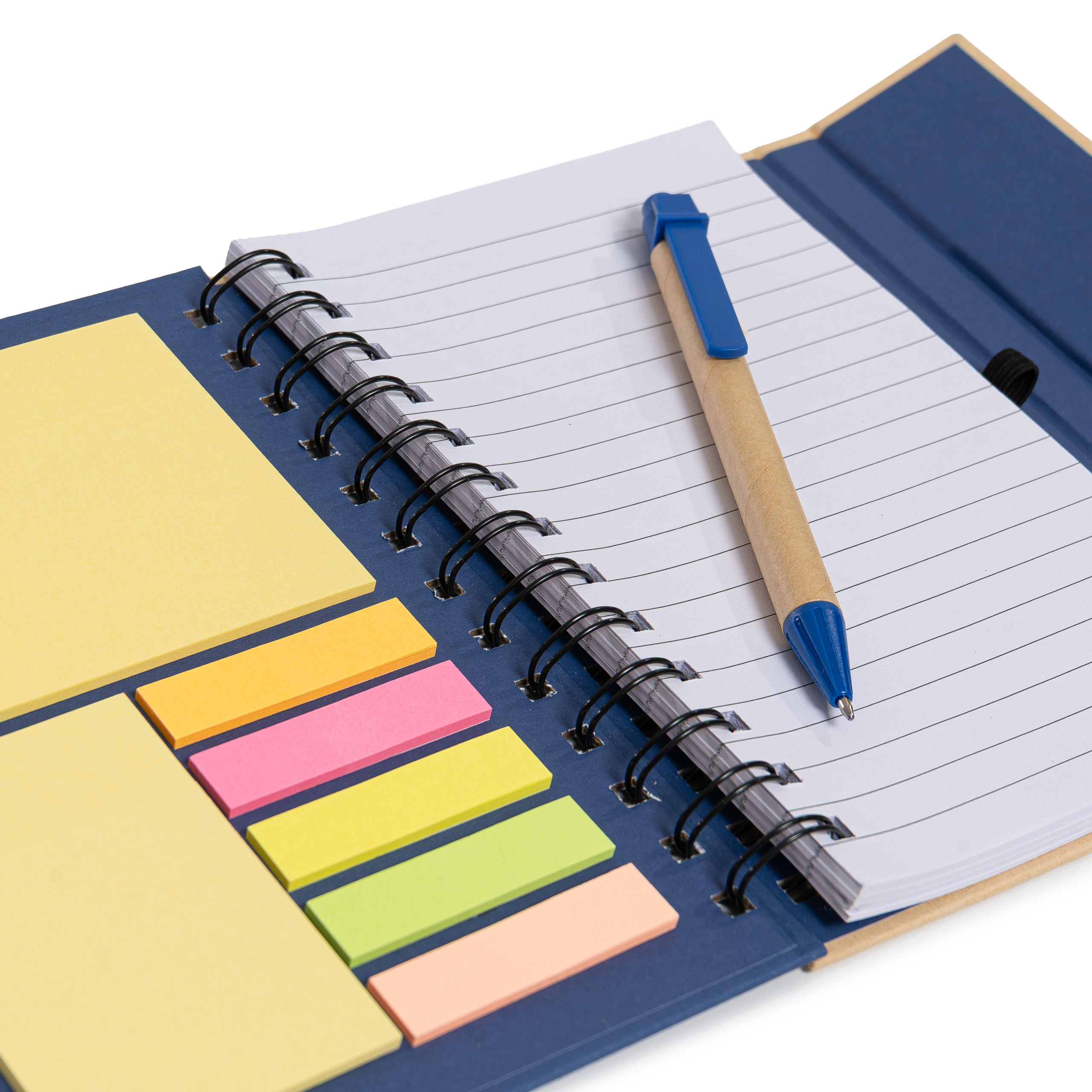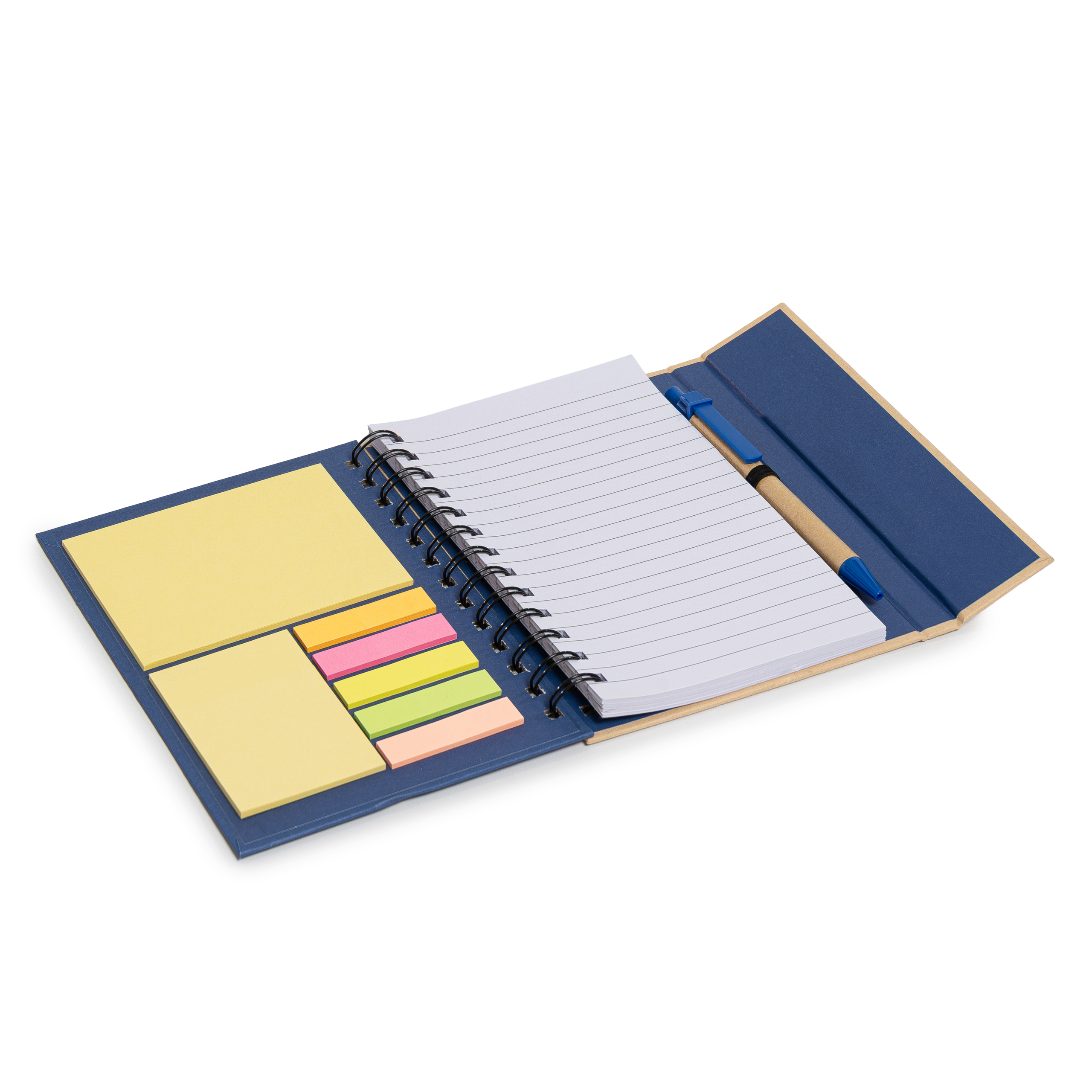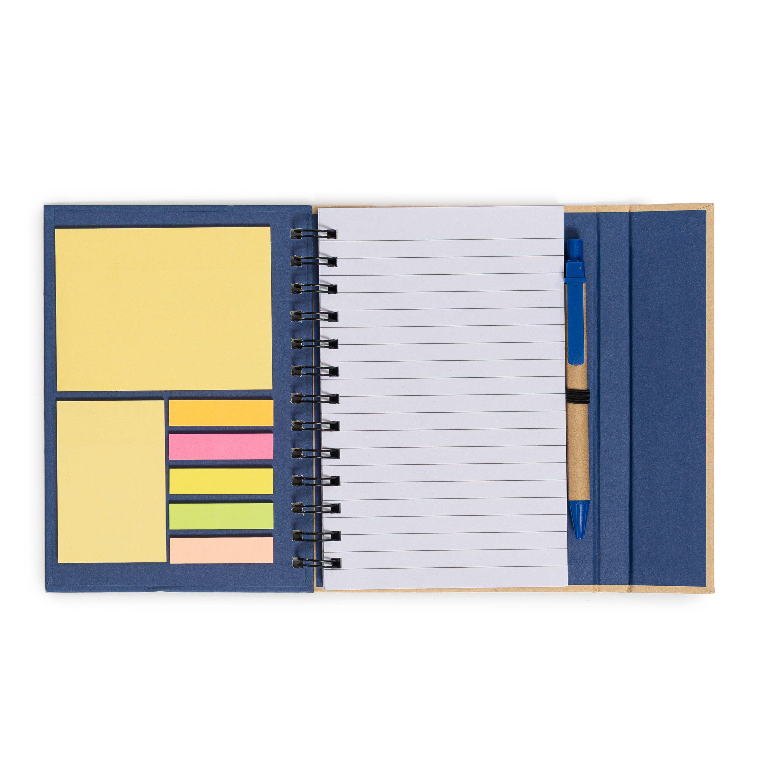 Descripción: Cuaderno ecológico espiralado, provee un bolígrafo ecológico de 14cm, block rayado de 70 hojas, en la tapa frontal un post-it de 10cm x 7,5cm, otro de 5cm x 7,5cm y 5 set de marcadores autoadhesivos. Tapa con cierre imantado.