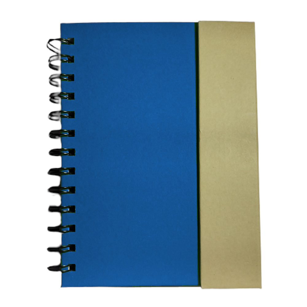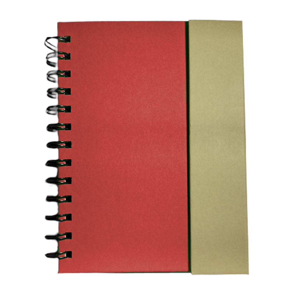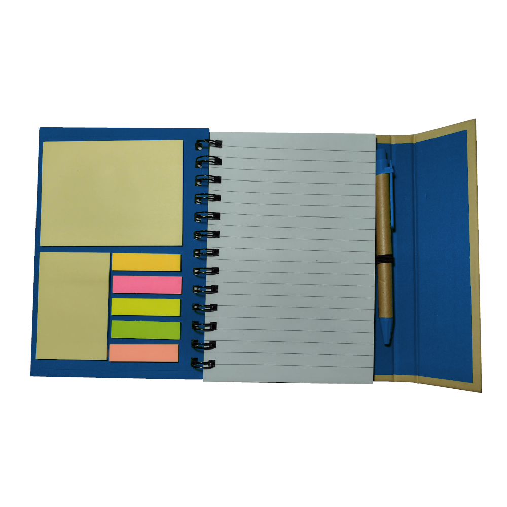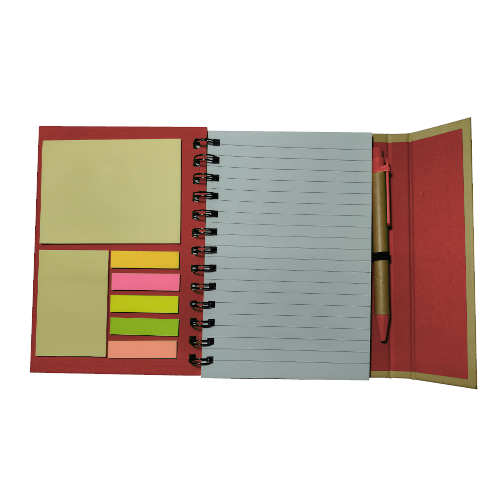 Descripción: Cuaderno ecológico espiralado, provee un bolígrafo ecológico de 14cm, block rayado de 70 hojas, en la tapa frontal un post-it de 10cm x 7,5cm, otro de 5cm x 7,5cm y 5 set de marcadores autoadhesivos. Tapa con cierre imantado.