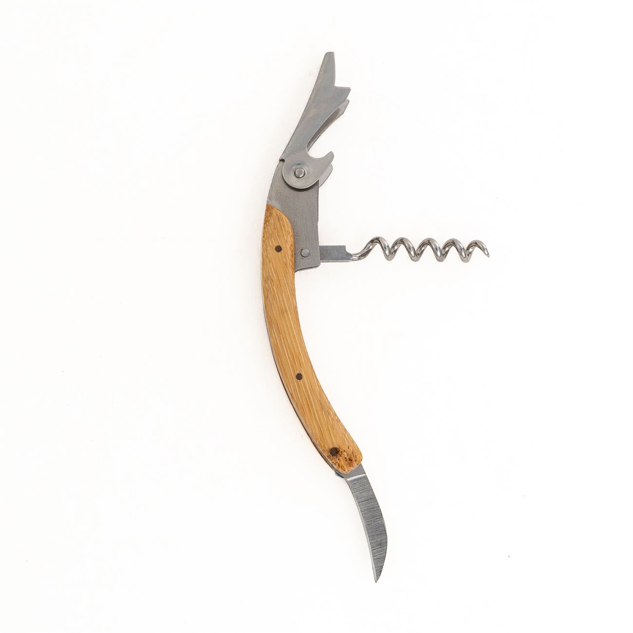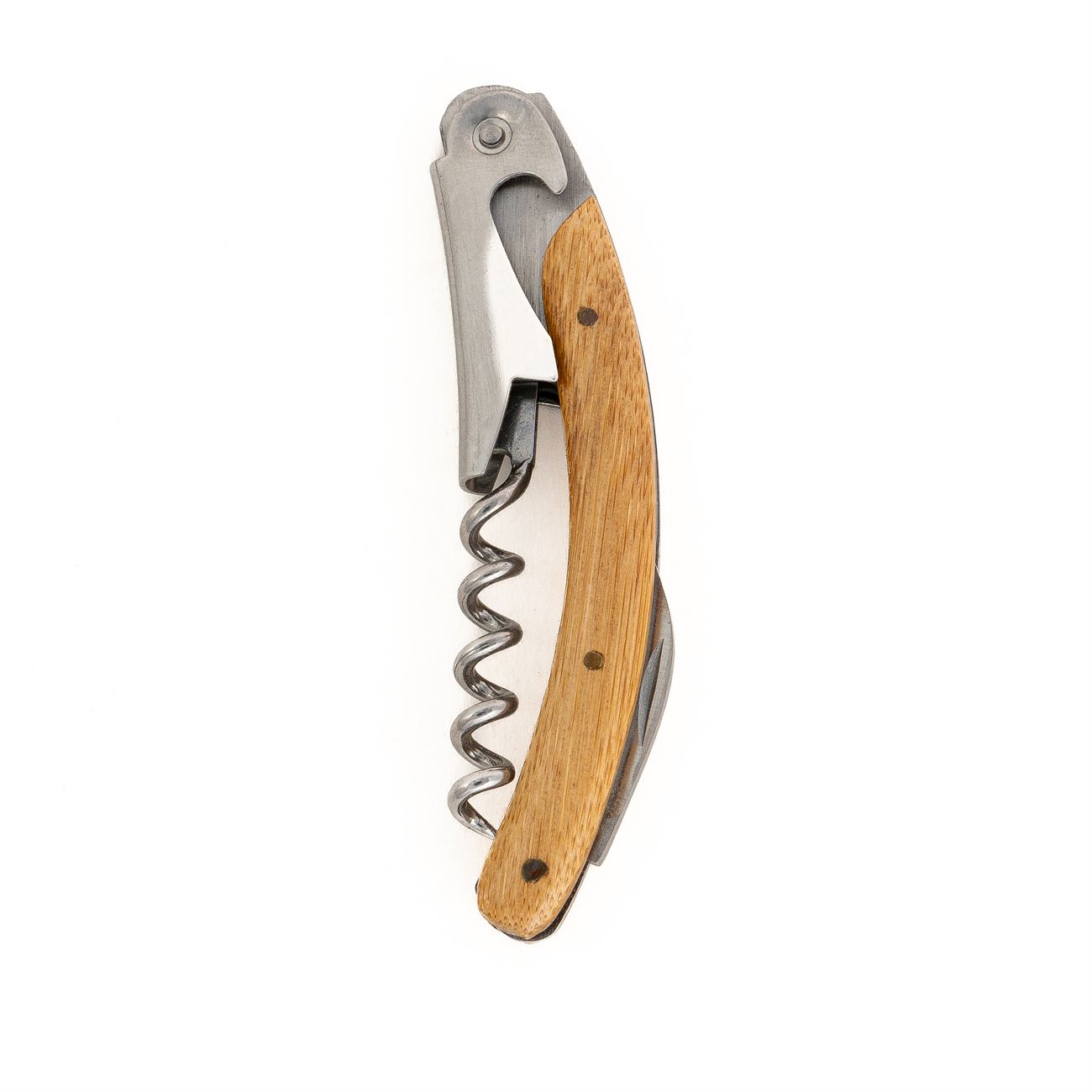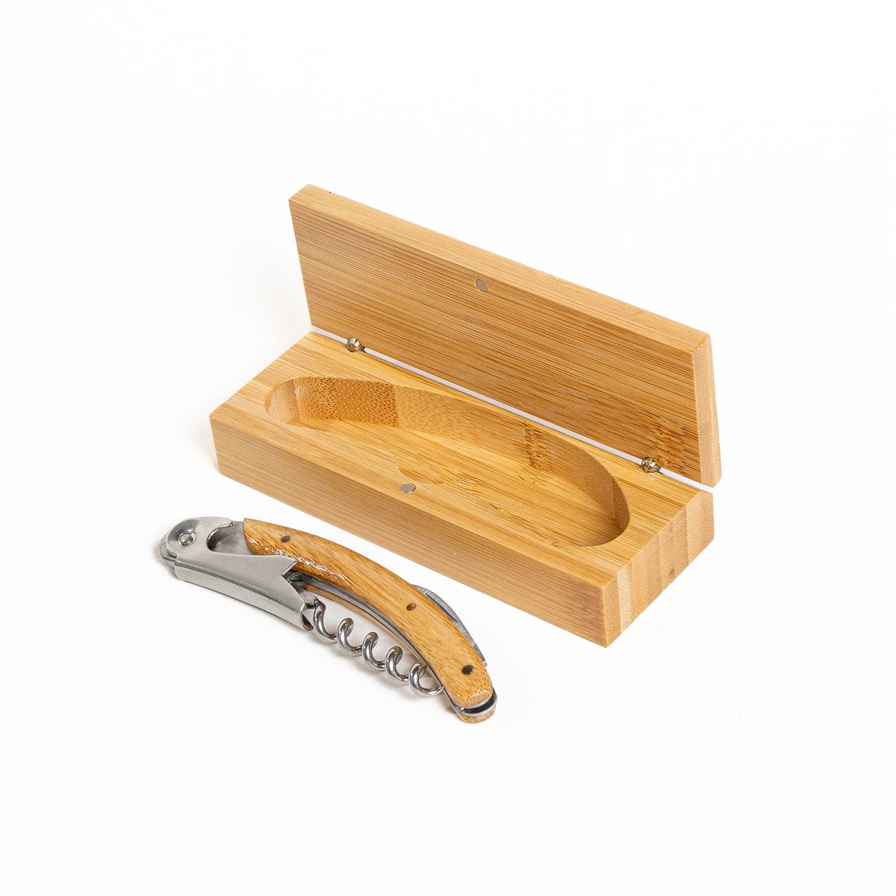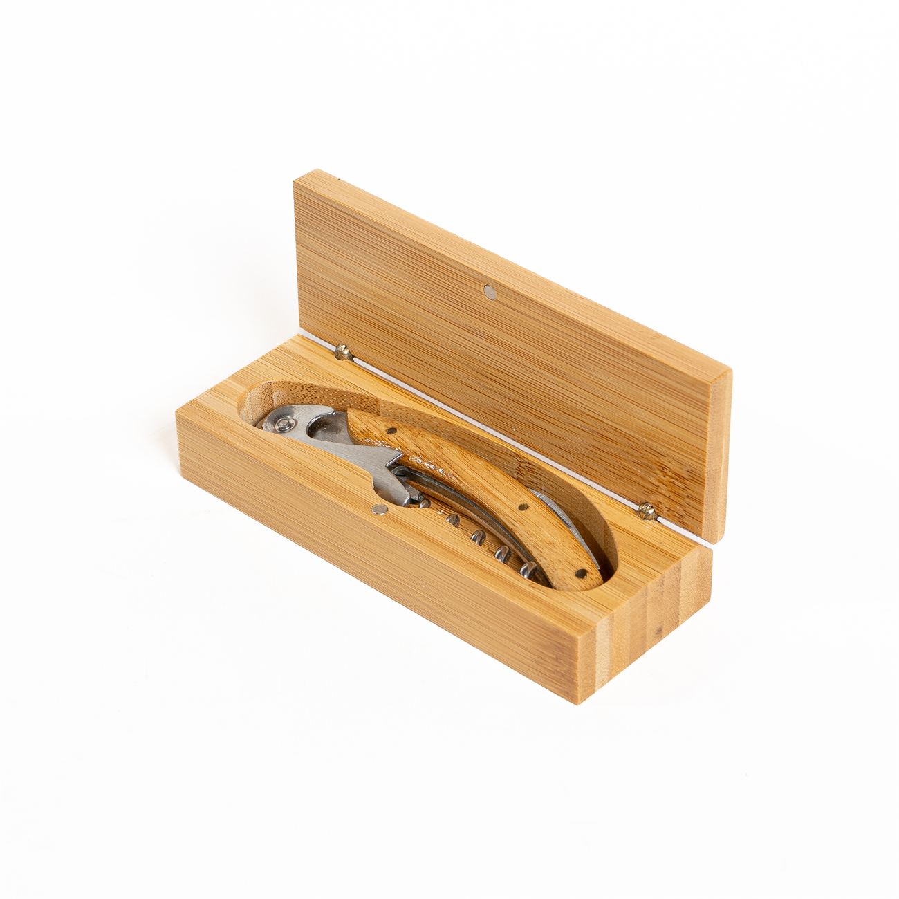 Sacacorchos de primera calidad, con tirabuzón metálico, con caja estuche de madera imantada. Este utensilio multifuncional de acero inoxidable incluye: