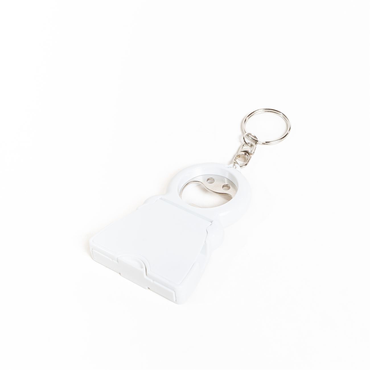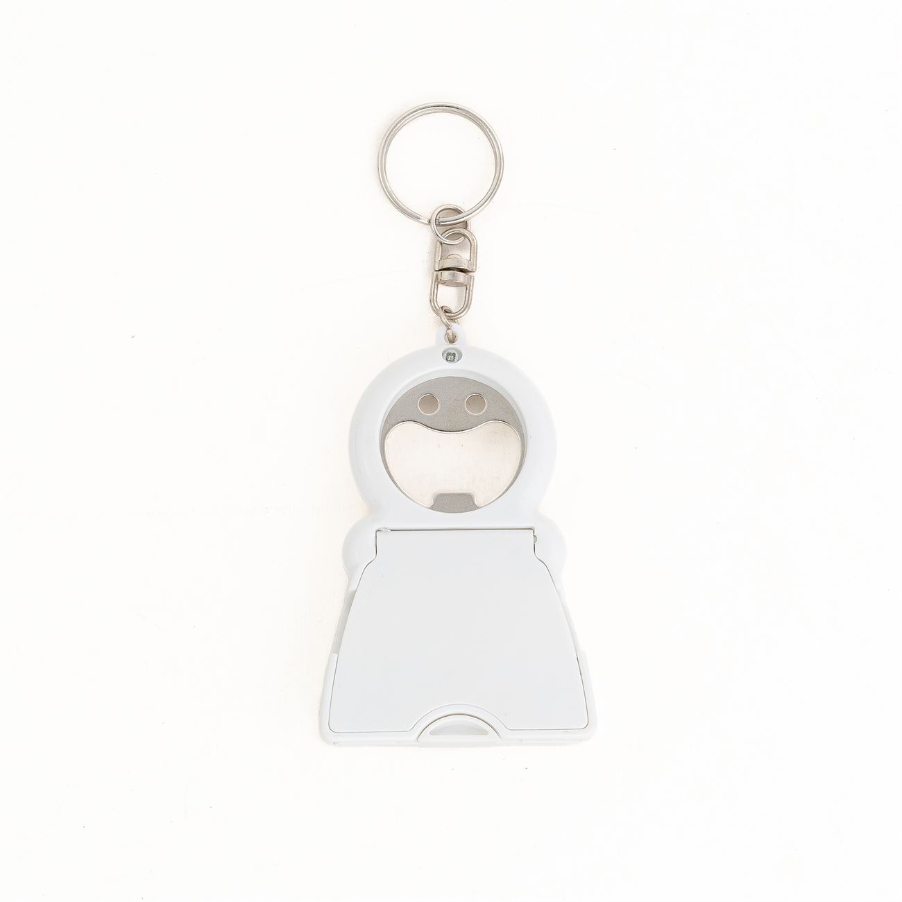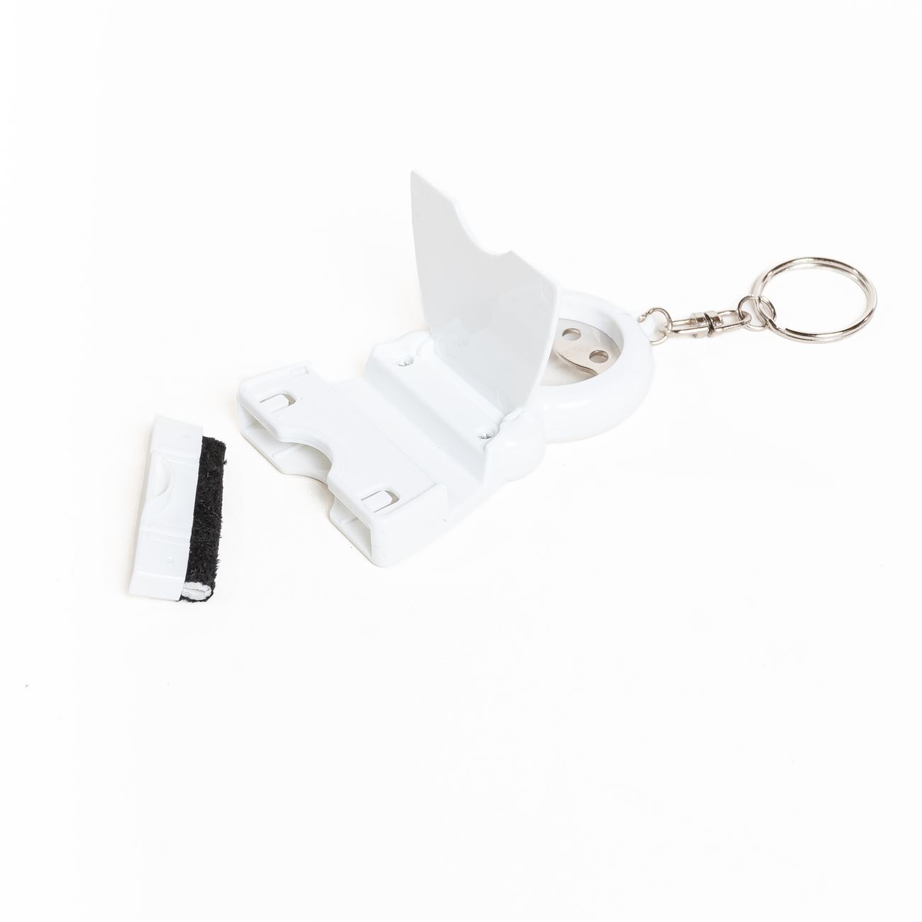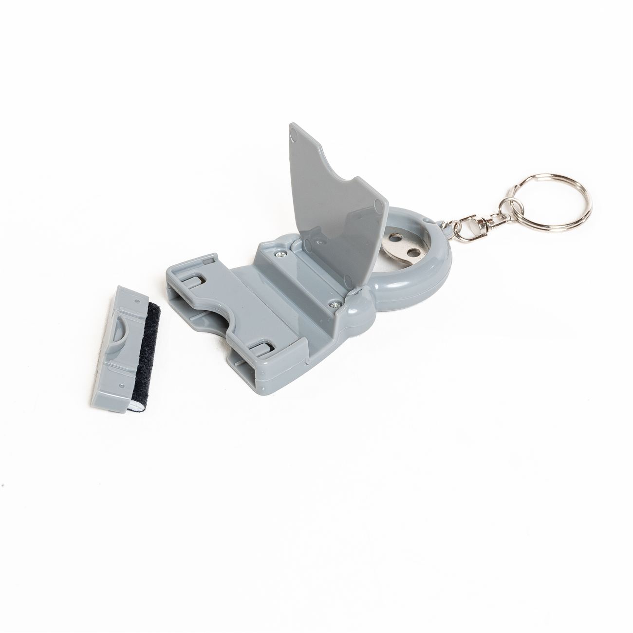 Descripción: Llavero Despatador con 3 Funciones, destapador, apertura frontal que lo trasforma en un soporte para celular e incluye insertada una almohadilla para limpieza del cristal del celular.