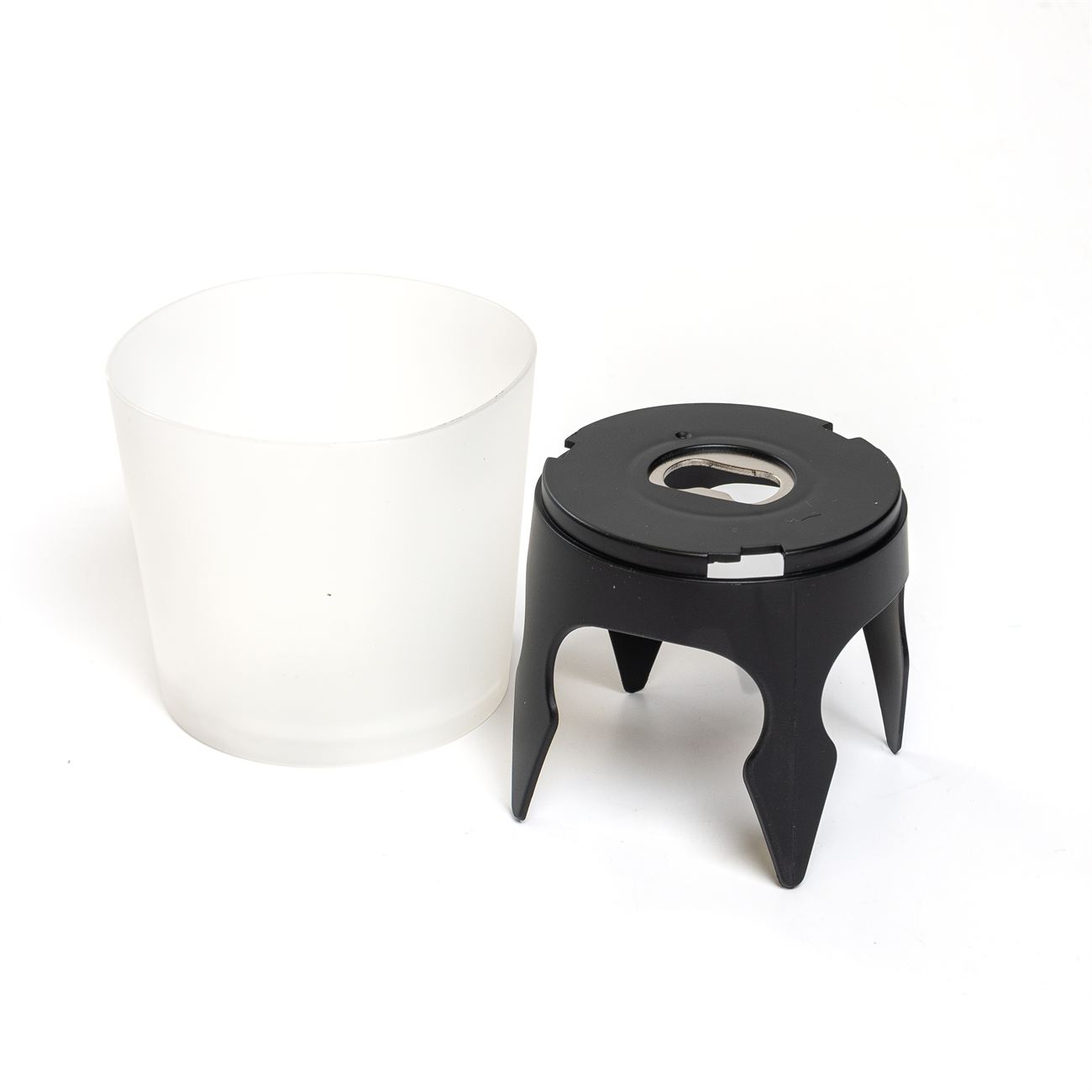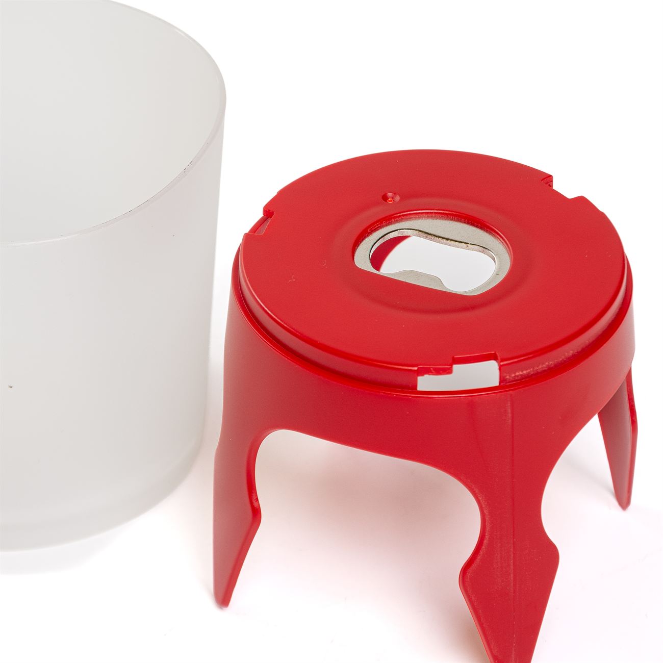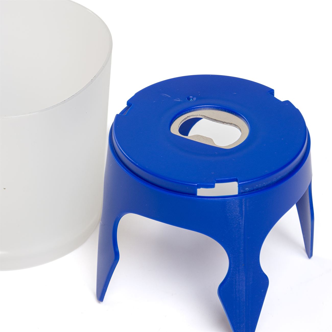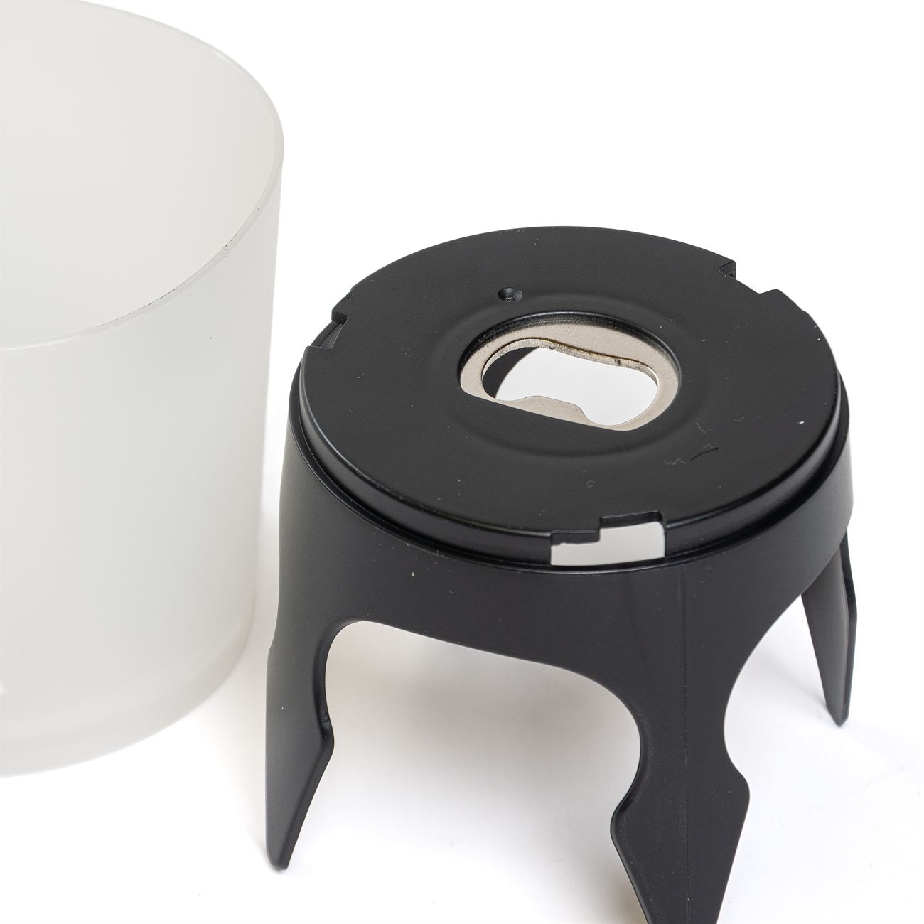 Descripción: Sujetador de objetos para el tiempo libre con destapador de botellas incluido. Compuesto por un recipiente contenedor superior y una base con anclajes y destapador metálico.