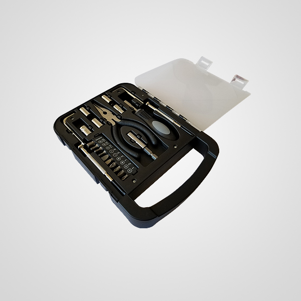 Descripción: Set de herramientas en estuche plástico termoformado con tapa traslucida y manija. Contiene una pinza, destornillador con nueve puntas intercambiables, dos extensores y 5 tubos, y dos destornilladores pequeños y dos llaves Allen.