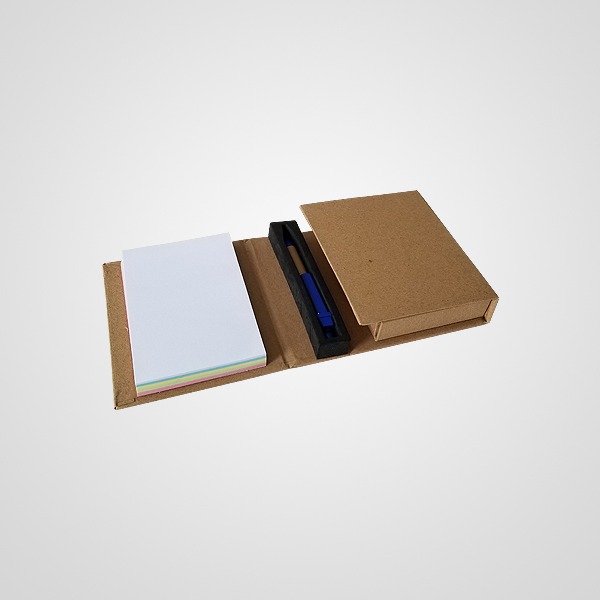 Descripción: Porta taco con bolígrafo ecológico. Apertura desplegable de cuatro solapas. Contiene taco adhesivo central, taco adhesivo lateral (menor tamaño), señaladotes adhesivos y taco tipo libreta lateral, también el bolígrafo en su contenedor.