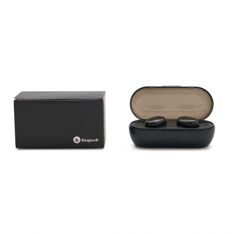 Auriculares inalámbricos con estuche de carga y micrófono incorporado. Posee tecnología bluetooth 5.0, la capacidad del auricular es de 55mAh y su capacidad de carga es de 300mAh. Cuenta con cobertura bluetooth en una distancia de 10 metros y su duración en funcionamiento es de 3 horas seguidas. Mantiene la carga sin uso por 120 horas y el tiempo de carga es de 50 minutos. Funciones touch: un toque para pausar/reproducir música, dos toques para redial. Medidas: 8 x 3,5 cm. Kingtech.