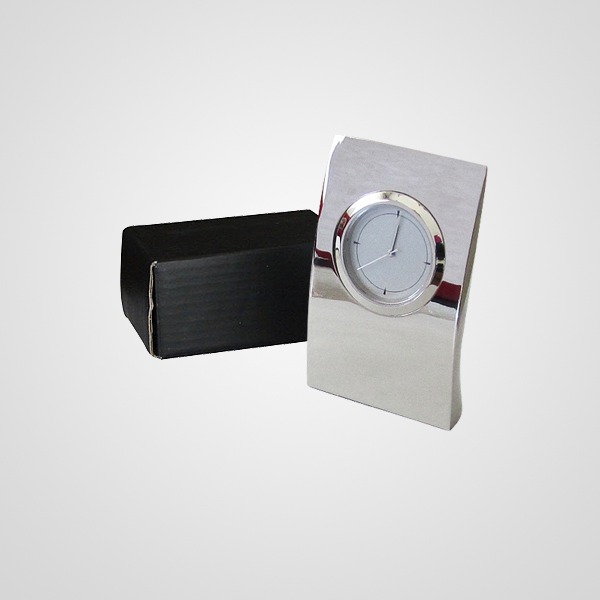 Descripción: Reloj de escritorio análogo curvo metálico, terminación en cromo.