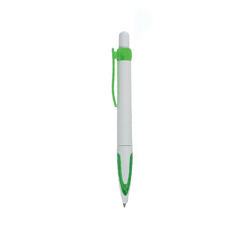 Bolígrafo plástico de cuerpo blanco con clip y grip en colores con transparencia. Apertura con pulsador. Tinta Negra 700 m de longitud de escritura.