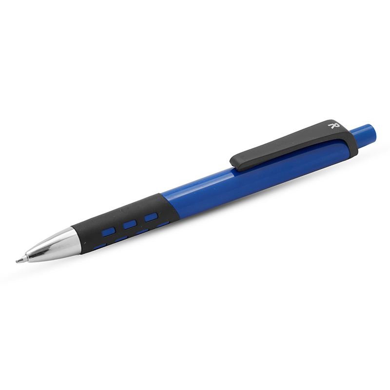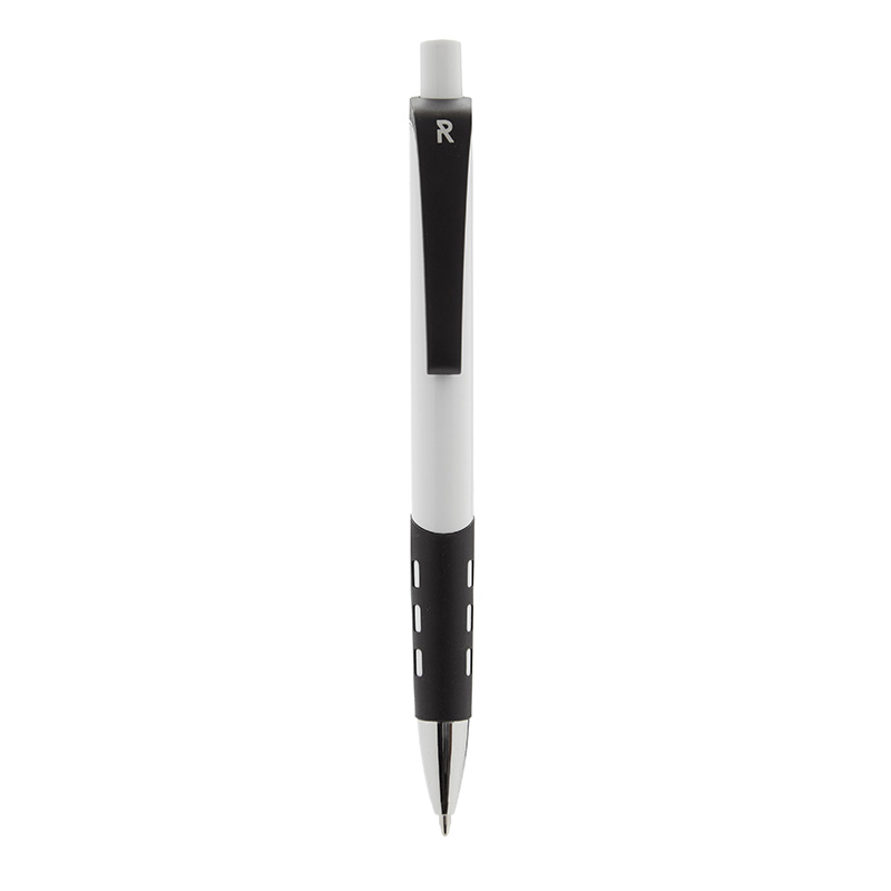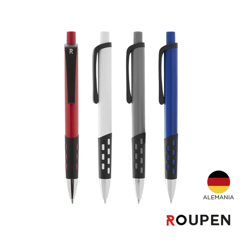 Bolígrafo de plástico, con grip de goma y clip en color negro. Sistema de apertura con pulsador. Tinta negra. Roupen.