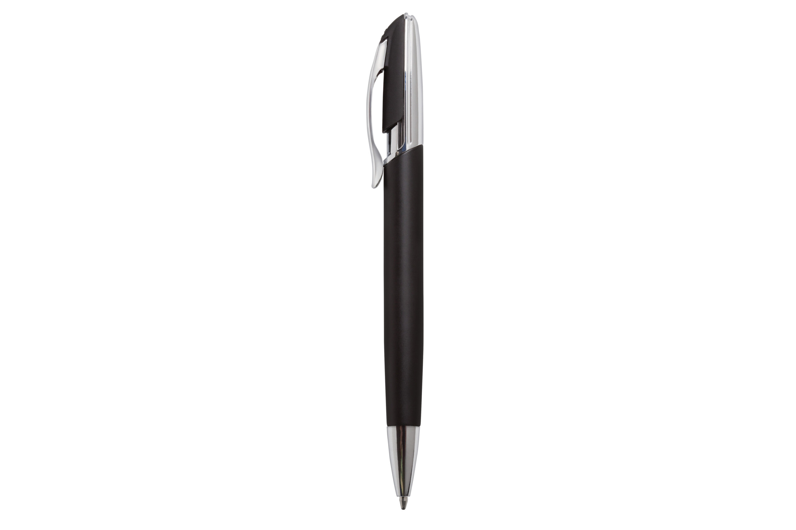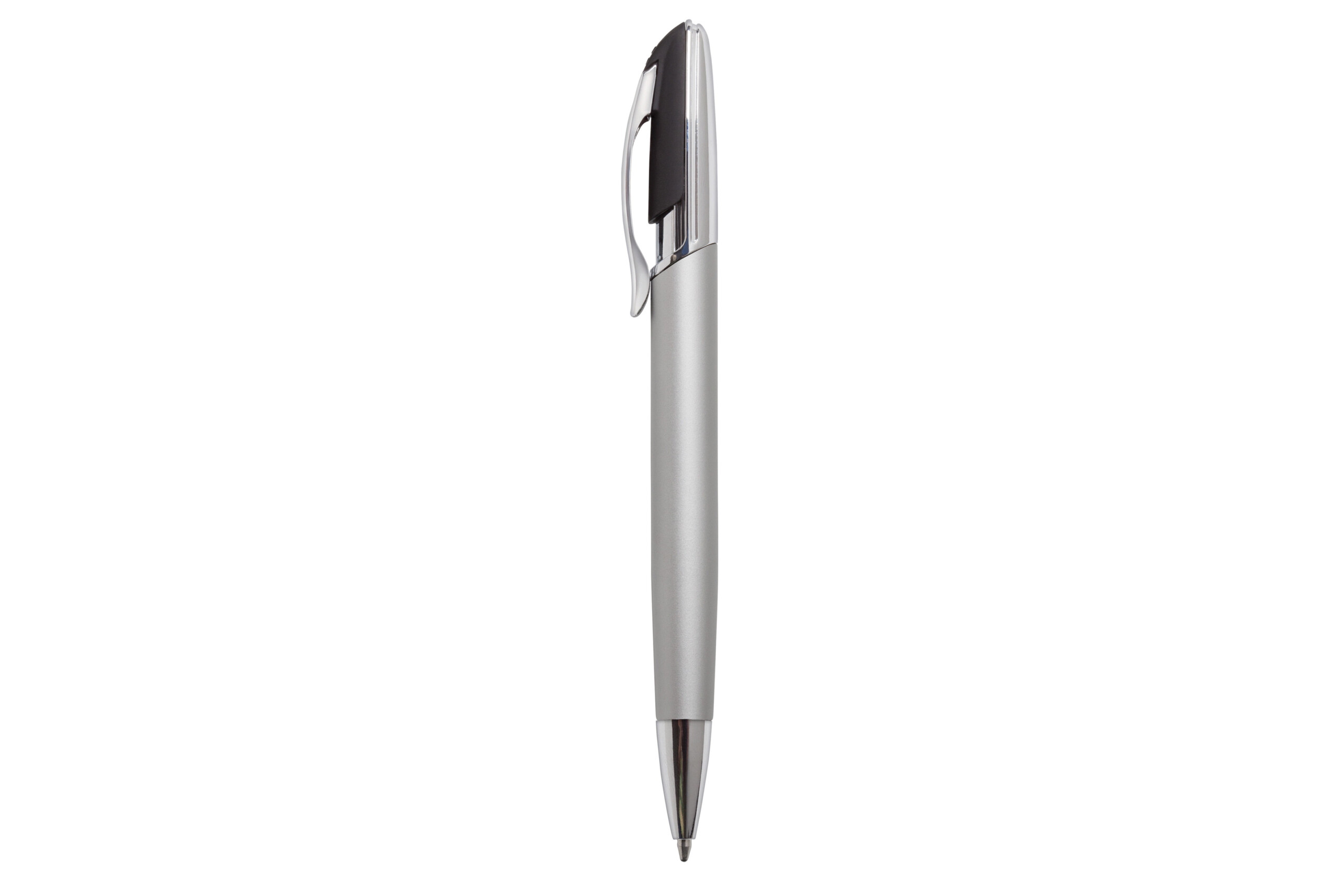 Aluminio. Cuerpo en aluminio opaco. Pulsador y puntera plásticos color plata brillante. Clip metálico.Tinta negra. Electroplateado.