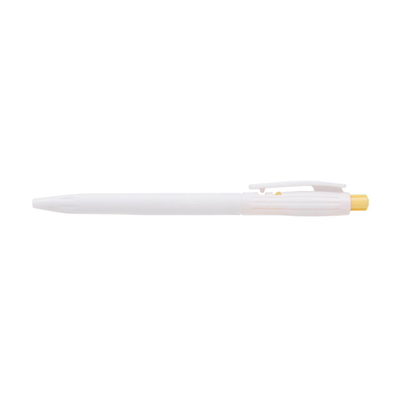 Bolígrafo confeccionado en ABS, de cuerpo de color blanco y clip en color. Apertura con pulsador. Tinta Azul. Tahg