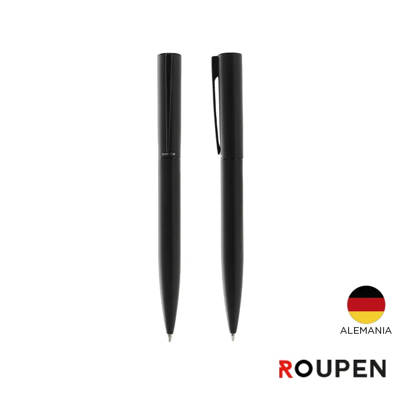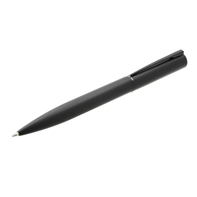Bolígrafo de acero con detalles en latón, acabado negro mate. Dimensiones: 13,6 x 1,25 cm. Cuenta con tinta azul.