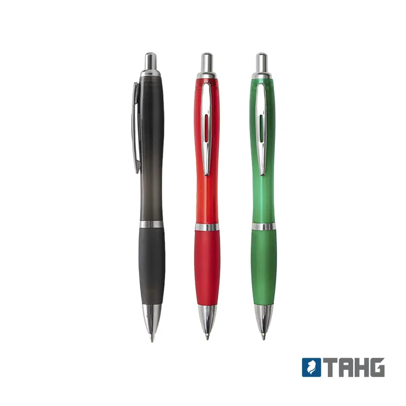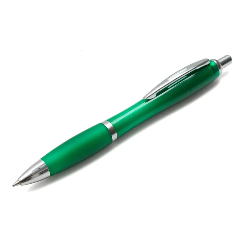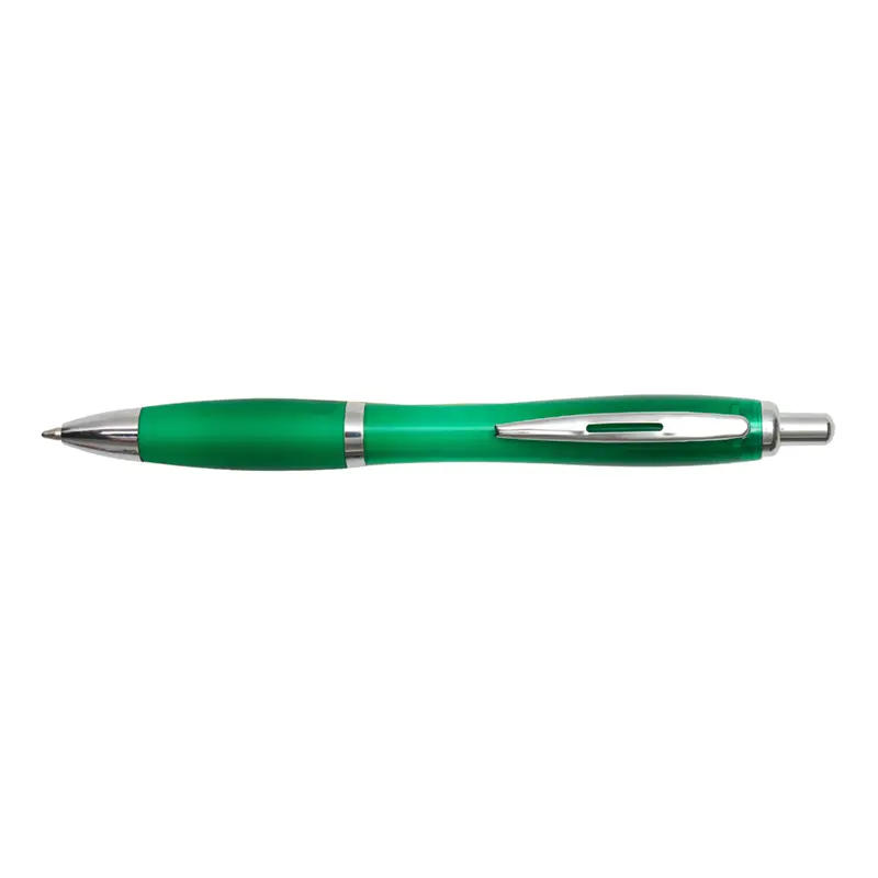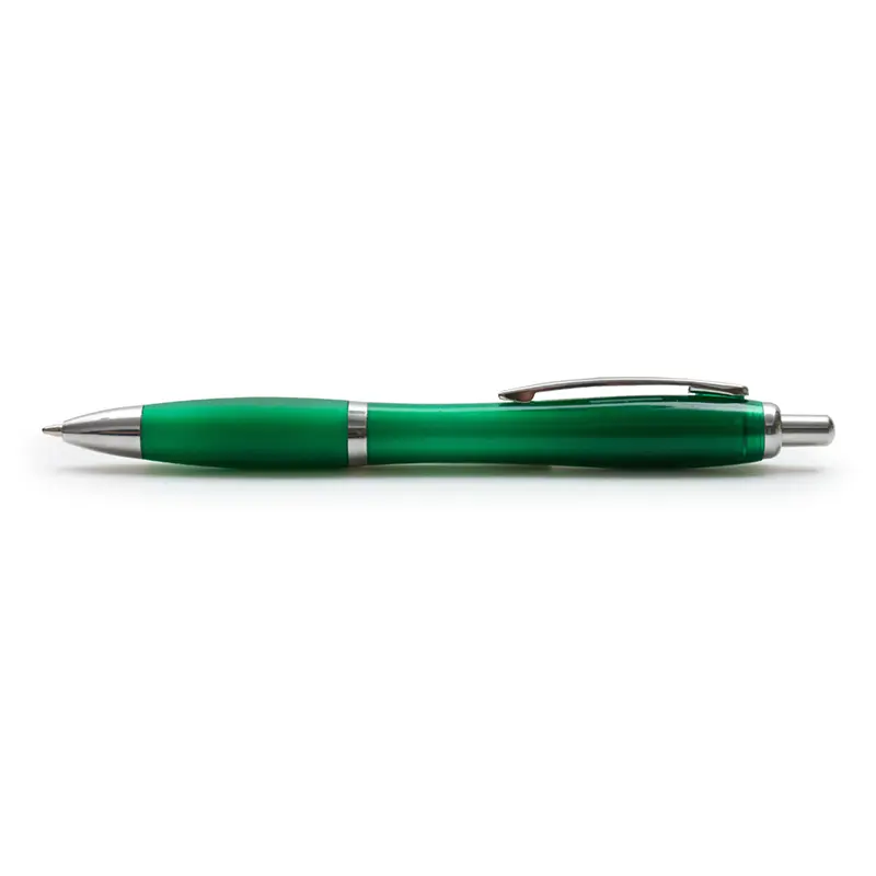 Bolígrafo con cuerpo curvo plástico en acabado degradado. Cuenta con grip de goma de color, clip y botón metálico, mecanismo retráctil y tinta negra.