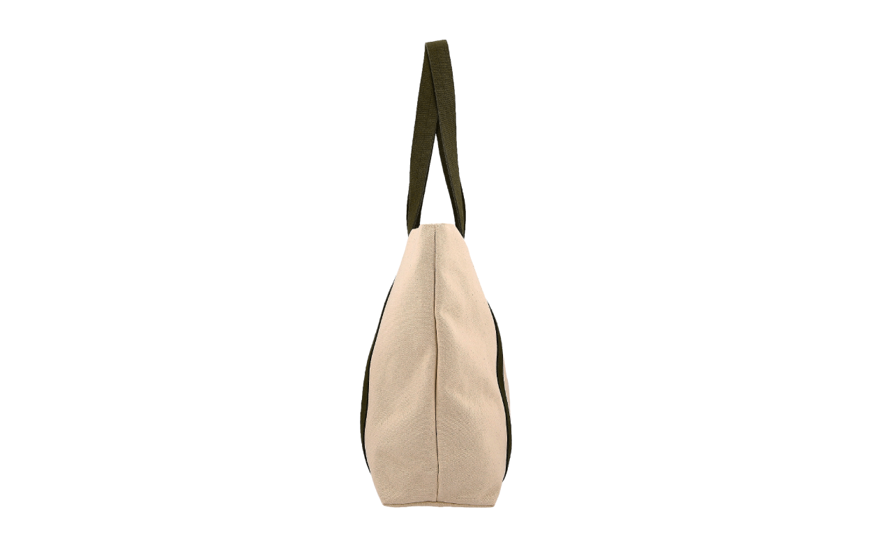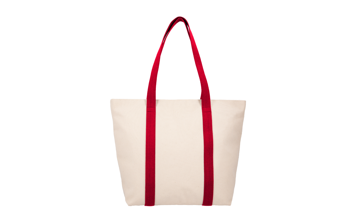Bolso de lona de 100% algodón con forro de Lienzo Crudo. Cierre con broche Imán. Manijas de cinta de diferentes colores tejida 100% algodón de 30 mm. Medidas : 46 x 38 x 13 cm