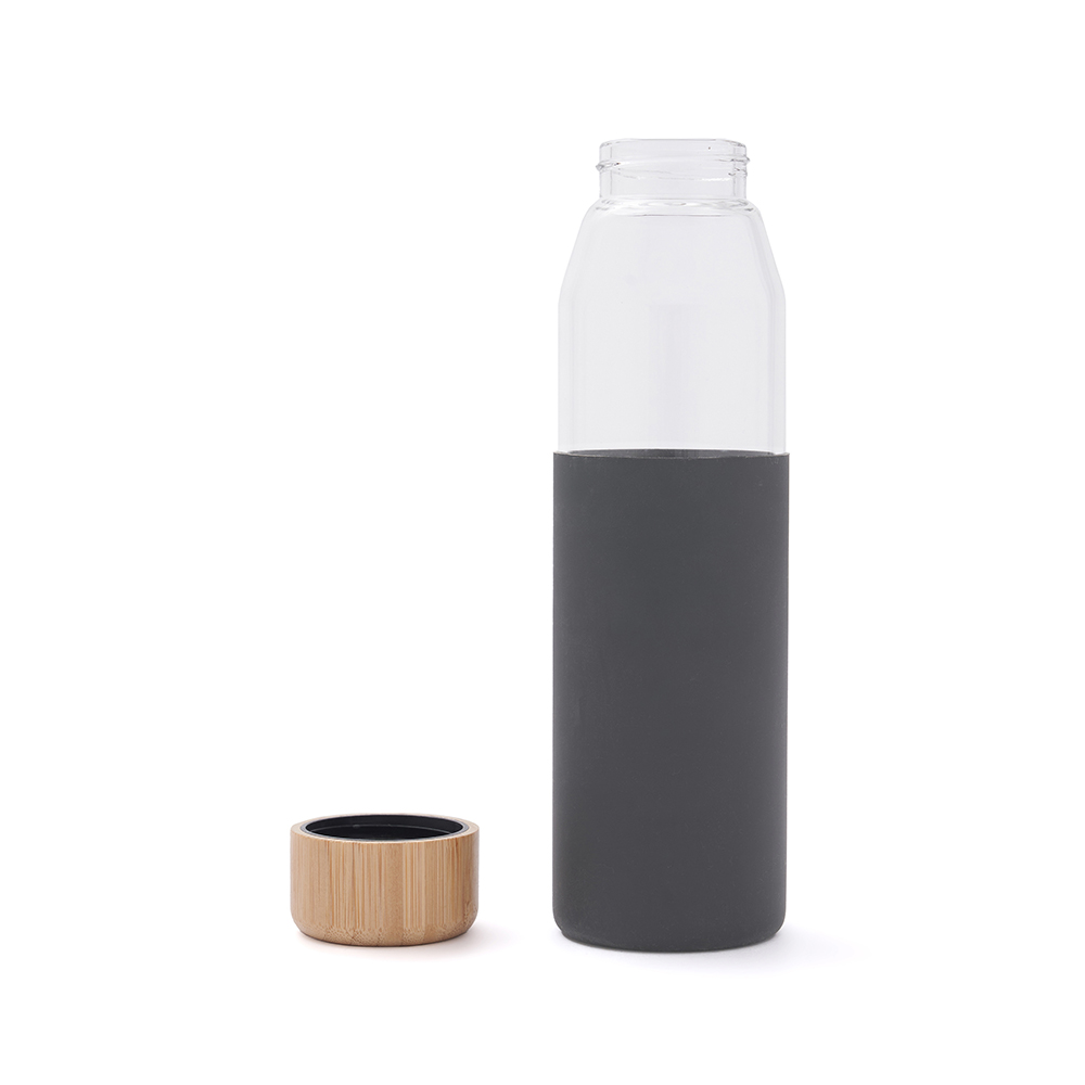 Botella reutilizable de vidrio de borosilicato, con tapa de bamboo y funda de silicona antidelizante. Producto libre de BPA. Producto aprobado por el I.N.A.L. para el contacto con alimentos. Capacidad: 550ml. Presentado en GiftBox. ReUseMe.
