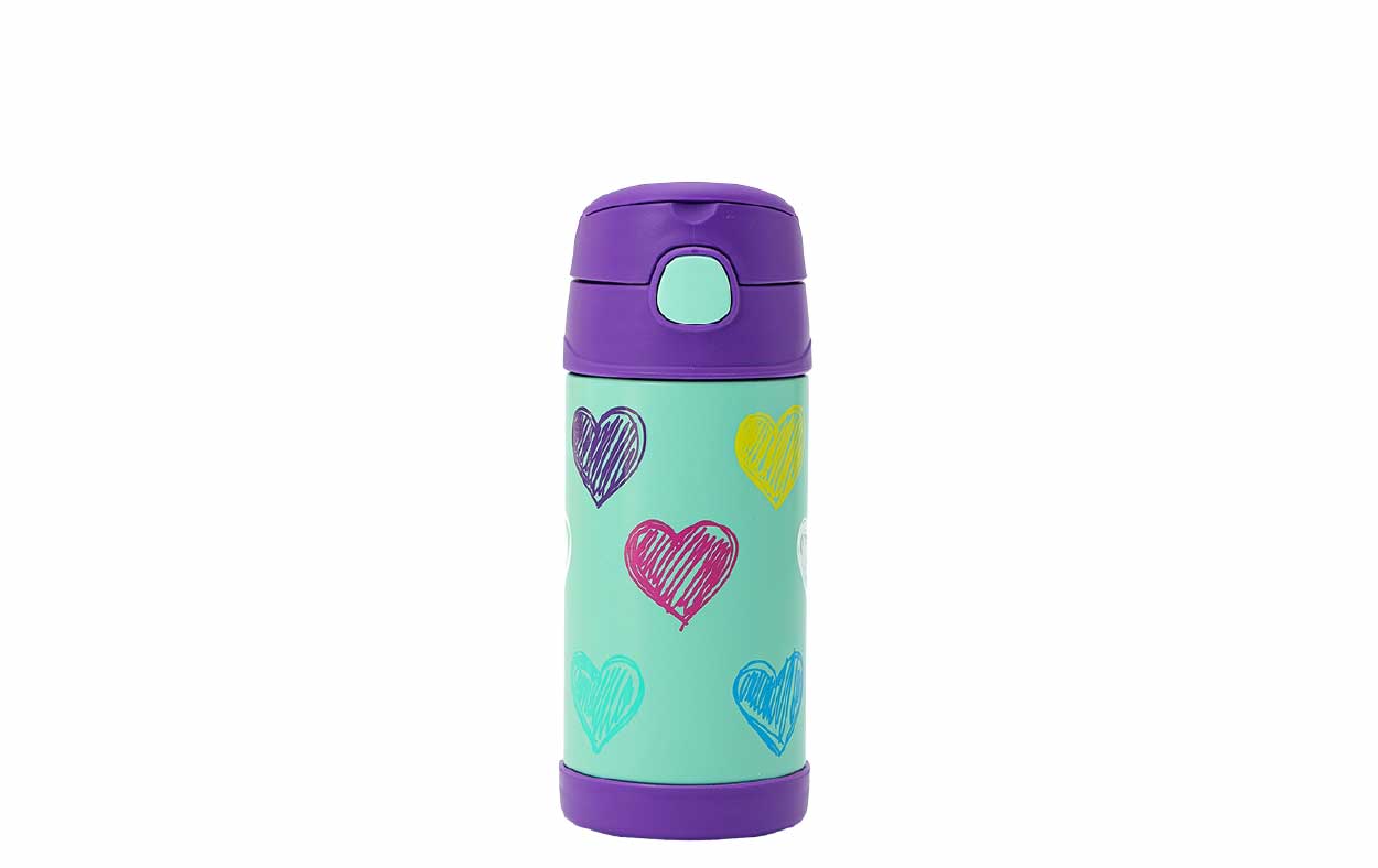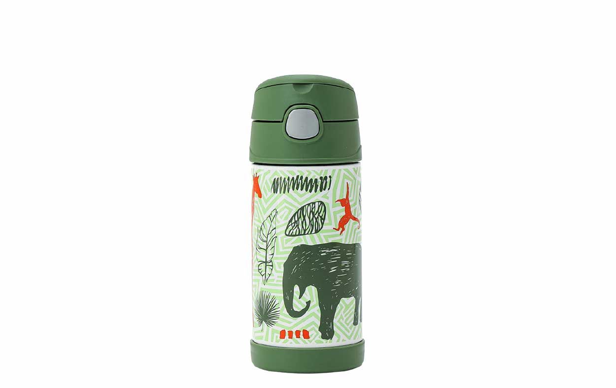 Botella térmica de acero inoxidable con aislamiento al vacío con capacidad de 355 ml con asa de transporte. Mantiene el frío hasta 12 hs. La estructura de acero inoxidable con doble pared resiste caídas y golpes. El sorbete de silicona se puede extraer para limpiar. No usar con líquidos calientes.