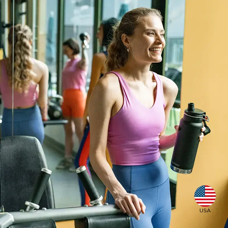 Cuenta con tapa a rosca de boca ancha con pico antigoteo Chug Cap para una hidratación rápida y gancho de agarre.