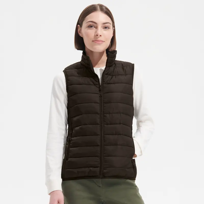 Chaleco ligero para mujer confeccionado en tafetán 280T. El tejido exterior y forro están fabricados 100% en poliéster, con relleno tipo plumón 100% poliéster. Cuenta con abertura y bolsillos laterales con cierre de nylon, cursor de metal con tirador de fantasía negro, cuello alto y terminaciones elásticas en la parte inferior y en las sisas para un mejor ajuste. Incluye bolsa para guardar la prenda. Es ideal para uso urbano, actividades al aire libre en climas frescos y como abrigo liviano para media estación.