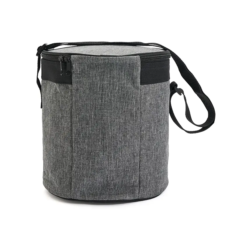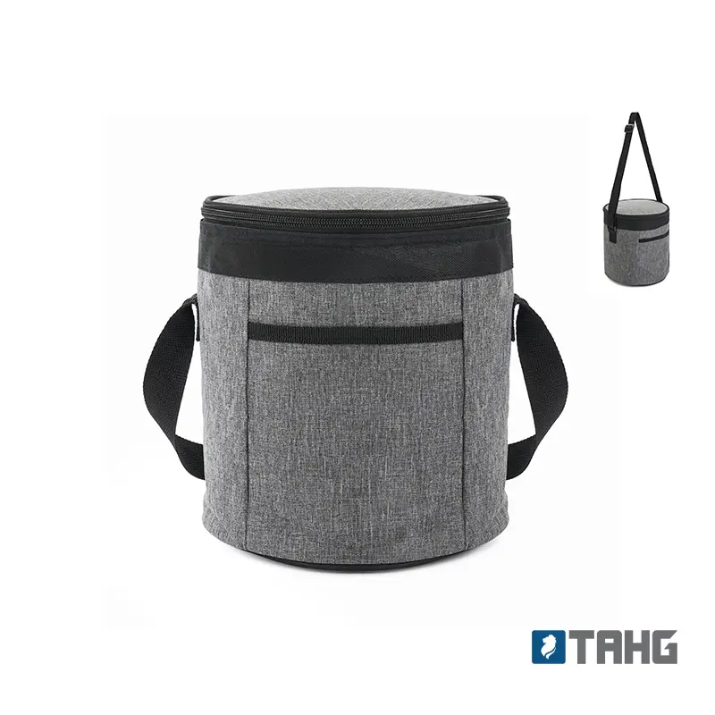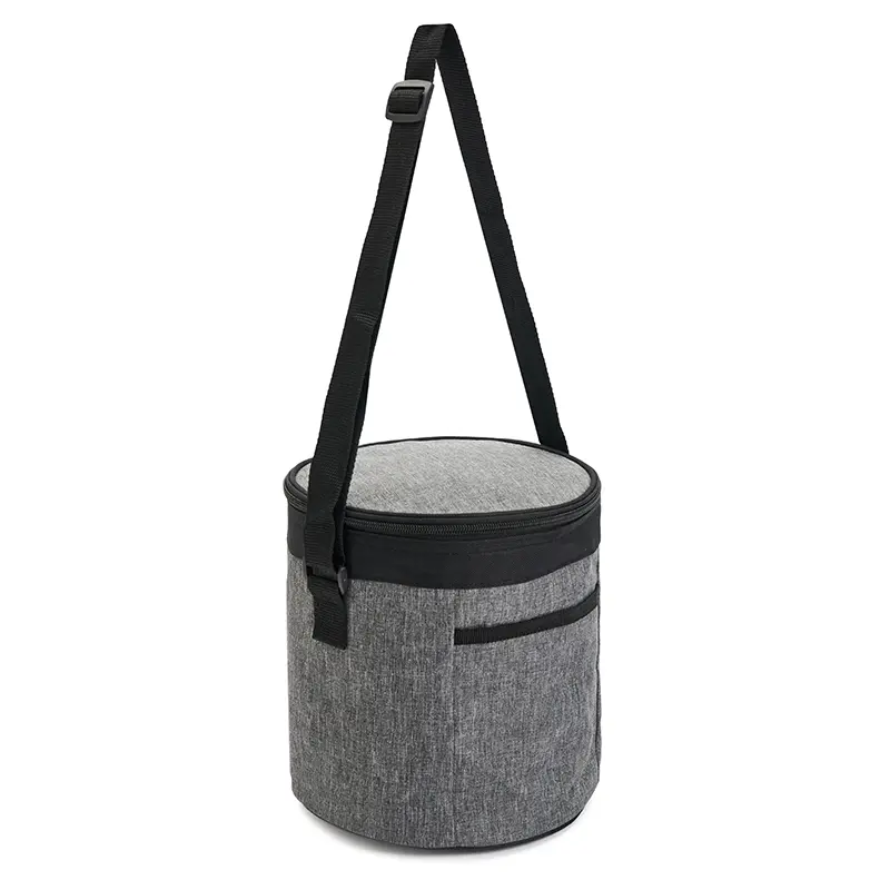 Cooler circular con manija superior y cierre. Está confeccionado en polycanvas 600D, con interior forrado en aluminio. Cuenta con compartimiento principal con cierre, bolsillo frontal y correa de mano. Es ideal para conservar alimentos y bebidas en traslados cortos al aire libre. Incluye forro térmico completo y estructura semirrígida.