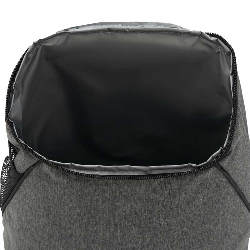 Cooler fabricado en Polycanvas en su exterior y Peva color gris con espuma 3mm en su interior. Cuenta con un compartimiento principal superior y un bolsillo con red lateral. Cierre color negro y cabezal de metal. Capacidad 12 lts. Medidas: 36 x 17 x 20 (Altura x Longitud x Ancho). Tahg.