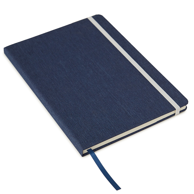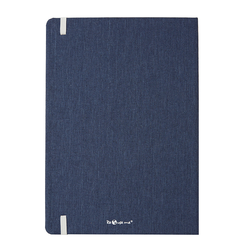 Cuaderno de tapa confeccionado con material RPET, hecho con botellas de plástico reciclado. Cuenta con una cinta marcadora y un cierre elástico. 96 hojas lisas de 70g de bordes redondeados. Medidas: 17,6 x 25cm. ReUseMe.
