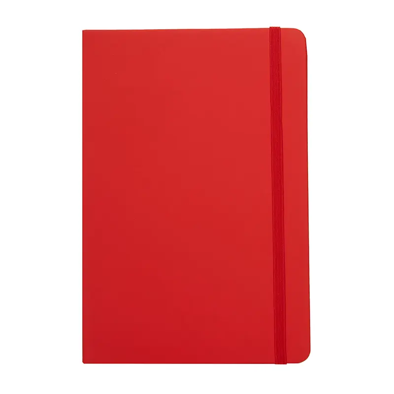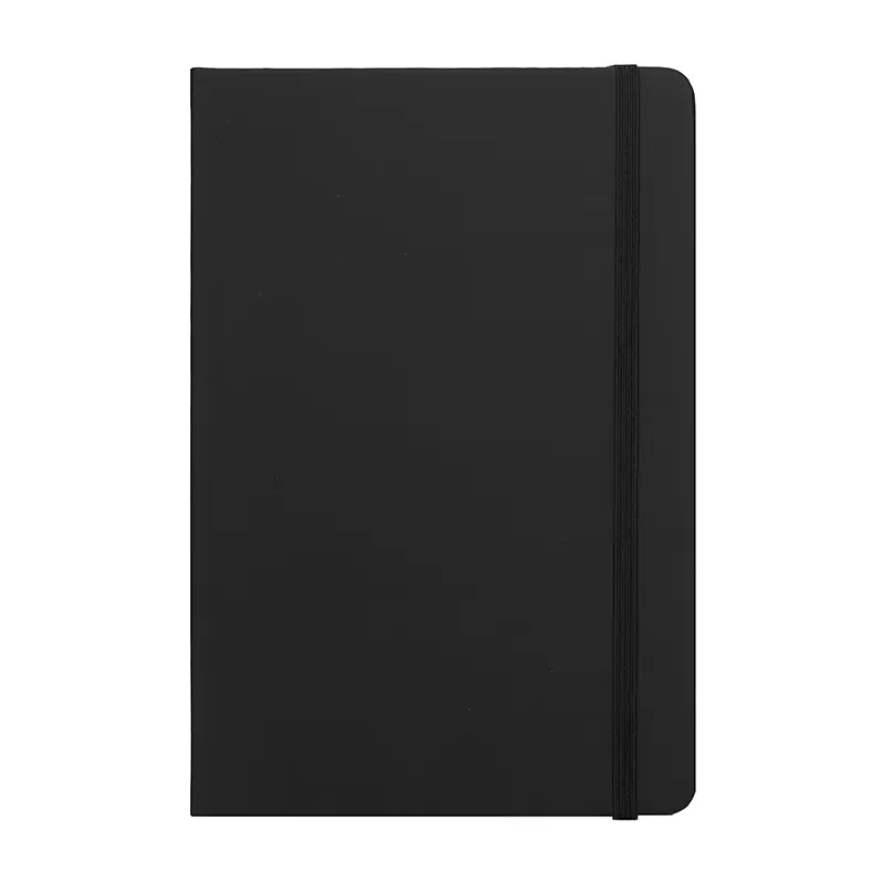 Cuaderno de tapa de dura de PU con 64 hojas rayadas. Cuenta con cierre elástico y cinta marcadora.