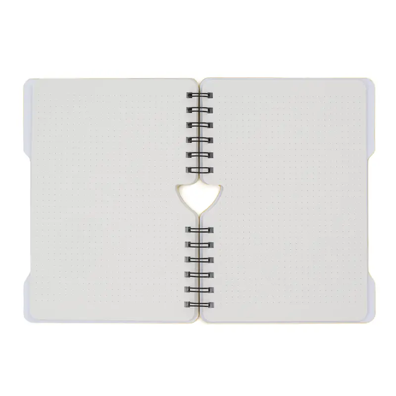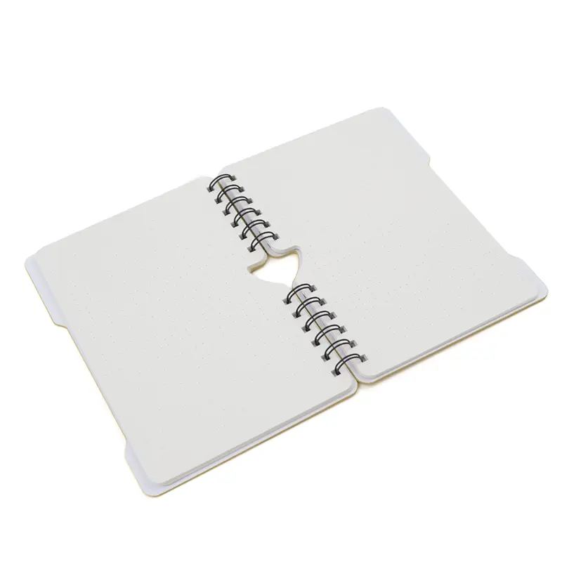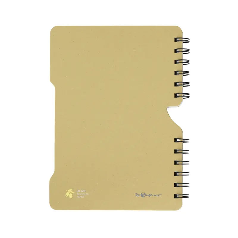 Cuaderno con tapa dura de material reciclado. Confeccionado en cartón con hojas interiores punteadas y anillado metálico. Con hojas internas de diseño punteado. Ideal para tomar notas, hacer esquemas o planificaciones personales y profesionales. Dimensiones: 140 x 205 mm. Reuseme