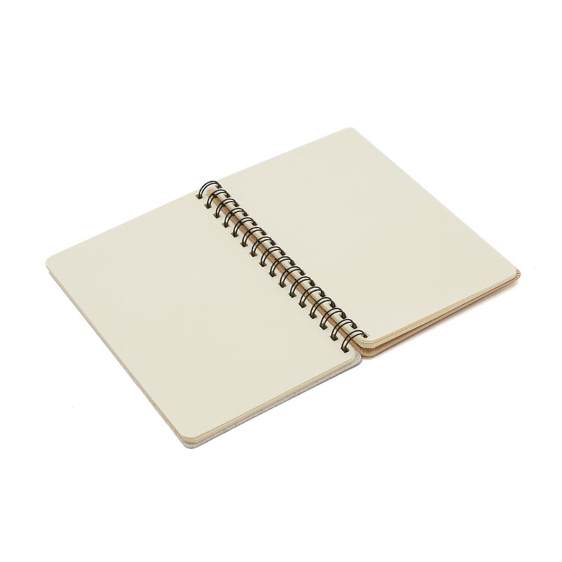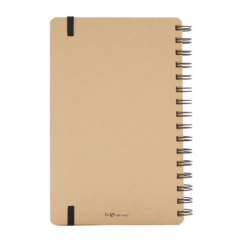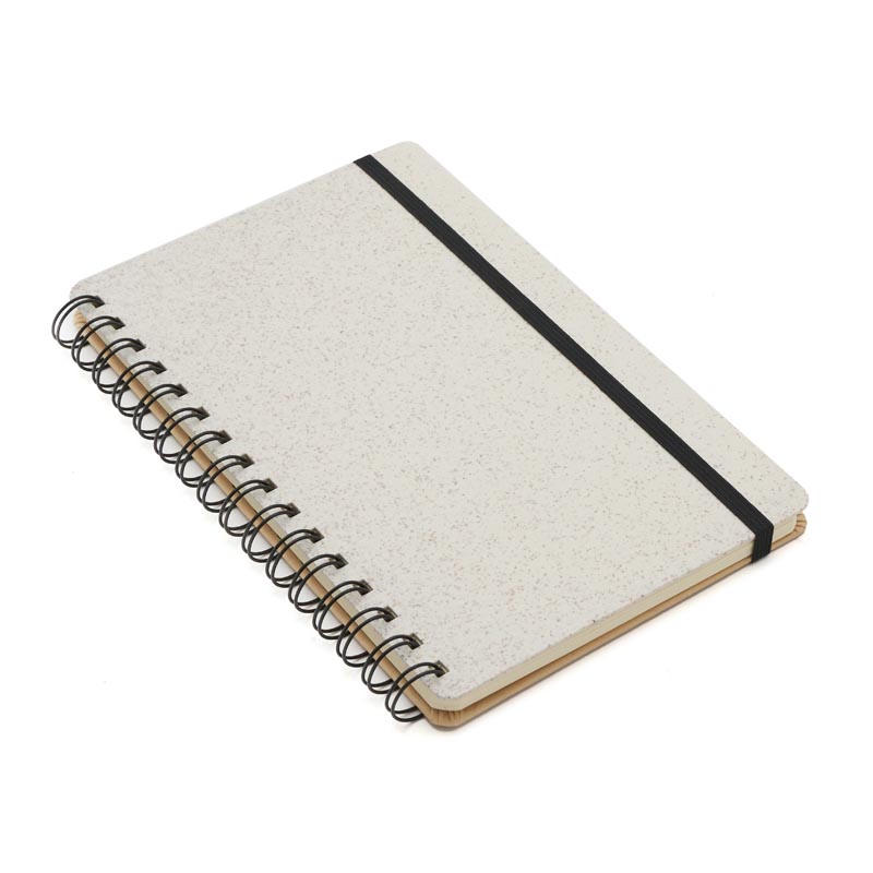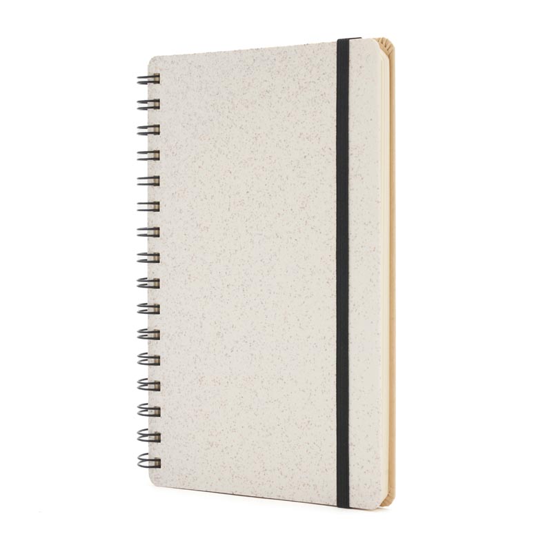 Cuaderno anillado de 80 hojas lisas de 70gr. Su tapa está confeccionada en Wheat Straw, pasta de tallo de trigo, un material sustentable que reduce el consumo de plásticos vírgenes. Cuenta con cierre elástico color negro.
