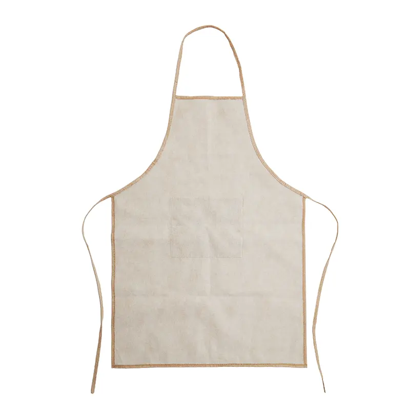 El delantal de ReUseMe está confeccionado en tela de Jute laminada con TNT, tela no tejida. Cuenta con dos tiras regulables para atar en la cintura y un bolsillo frontal. ReUseMe