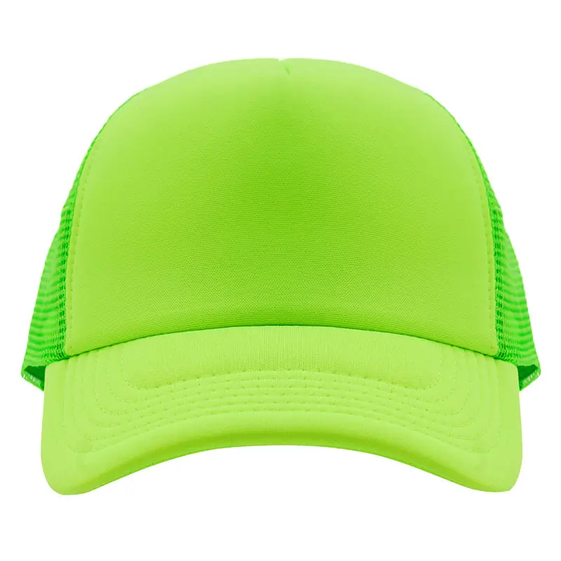 Gorro de 5 paneles en poliéster con parte trasera de tela de red. Disponible en colores fluorescentes: rosa, verde, amarillo, naranja y combinaciones de estos con blanco. Ajuste con broche plástico.