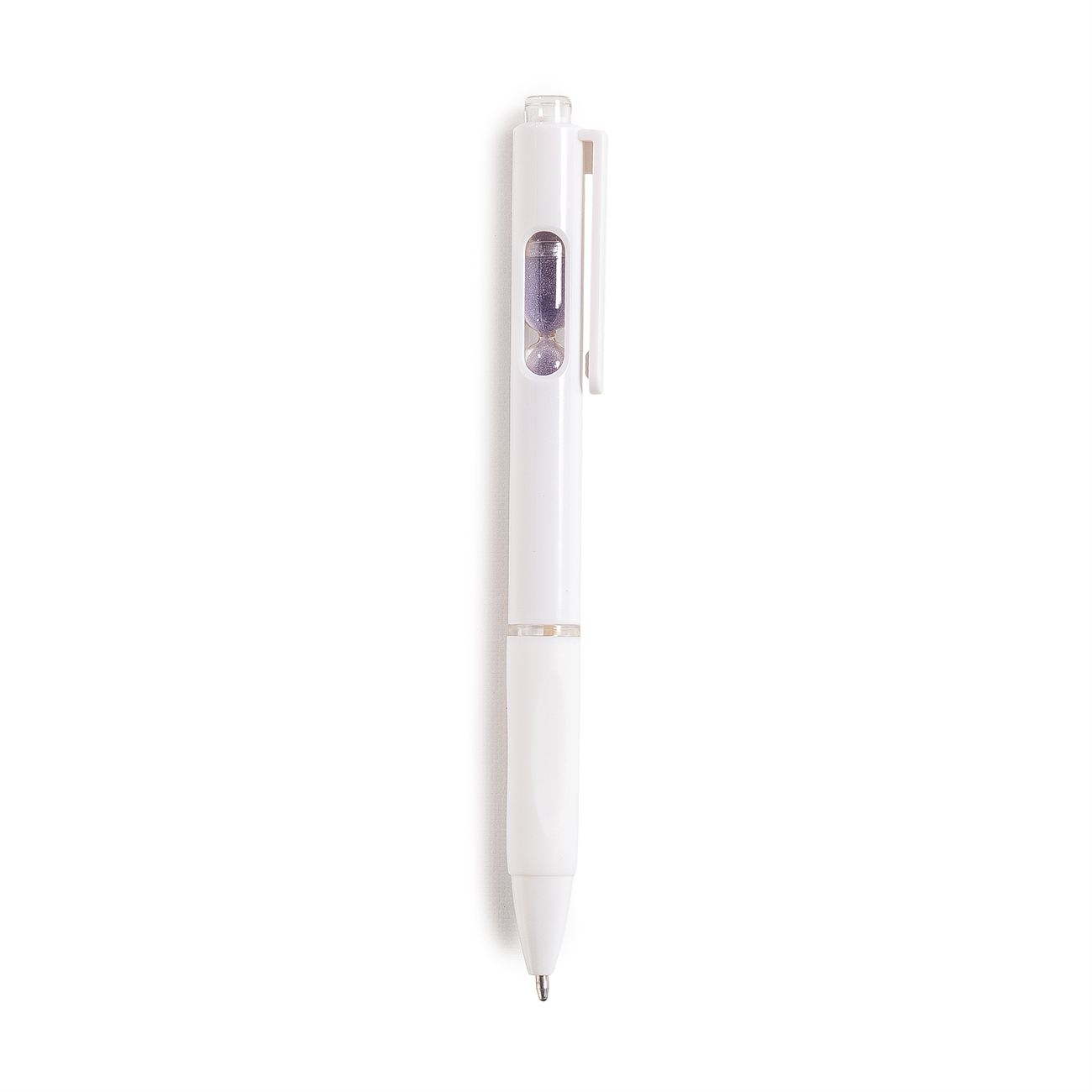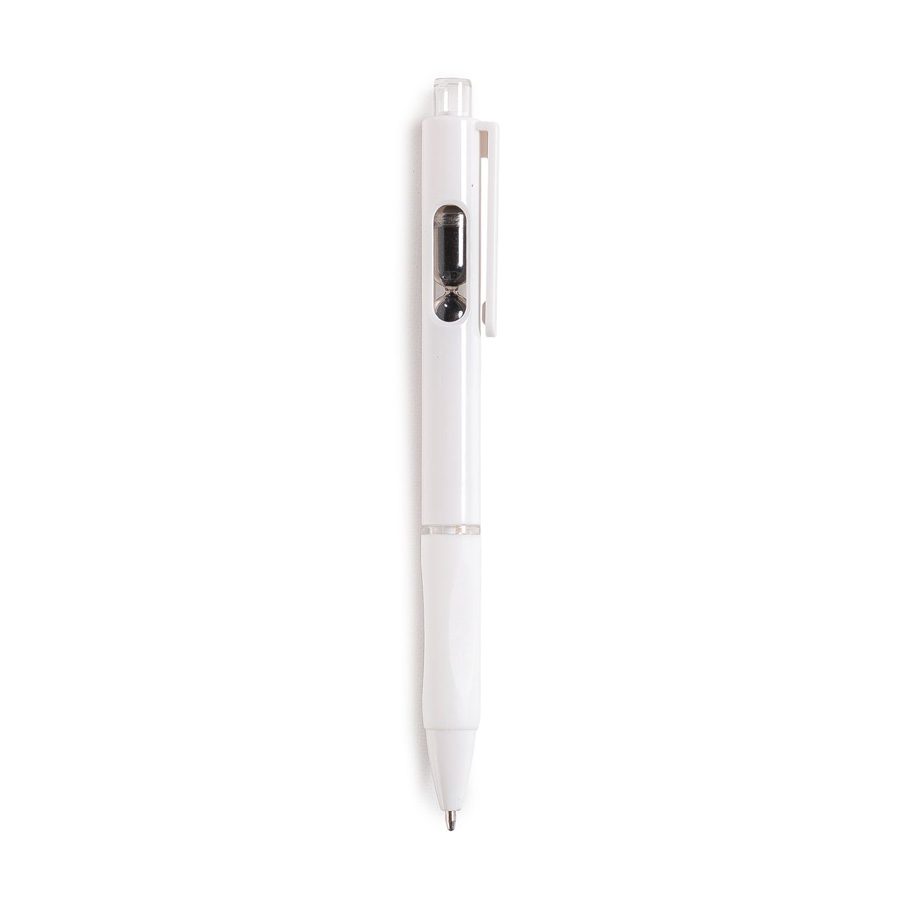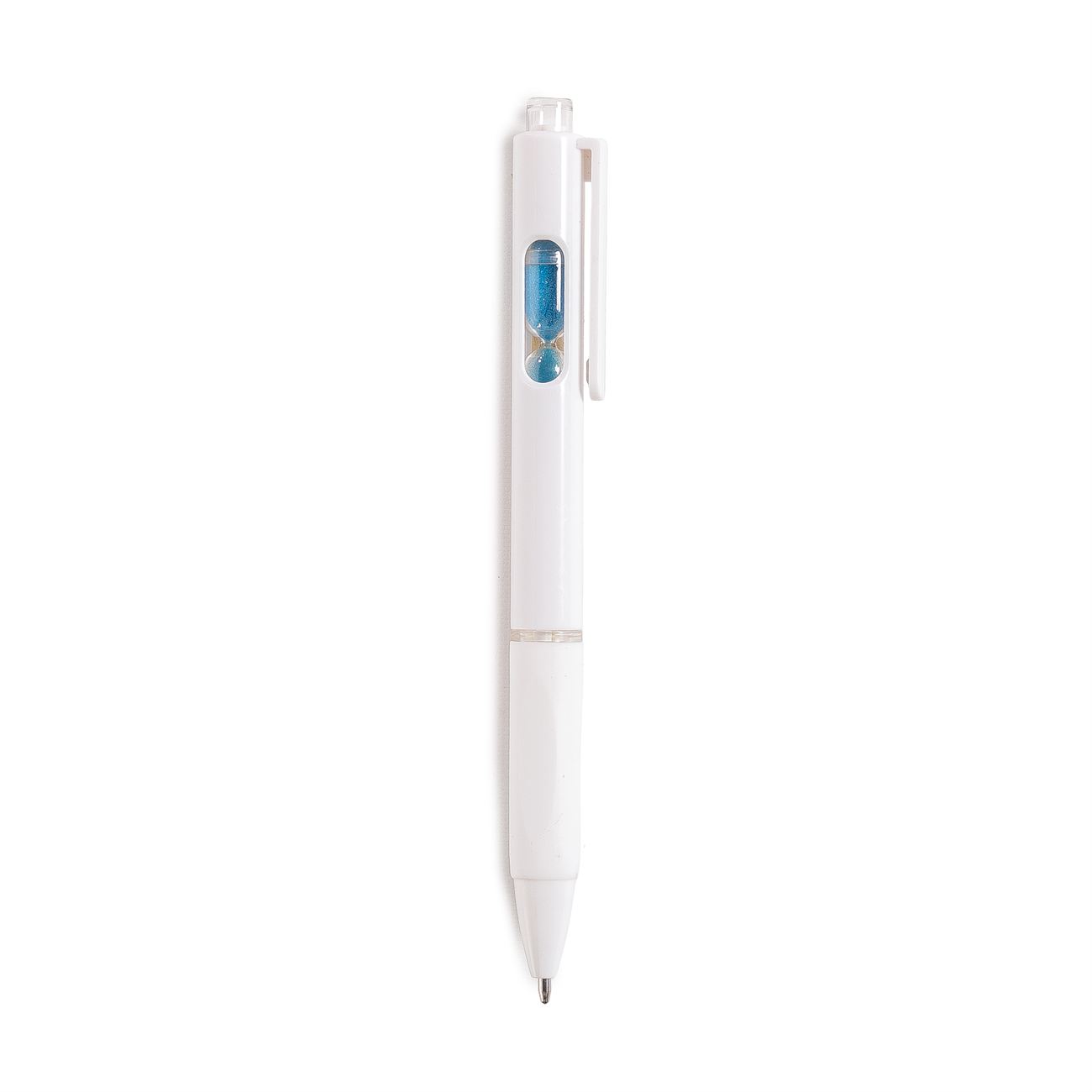 Bolígrafo retráctil con un pequeño reloj de arena en el interior. Cuerpo blanco, grip de goma, clip cristal y arena en varios colores.