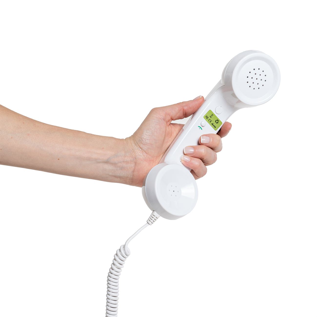 Trae botón de atención de llamada y corte, regulador de volumen.