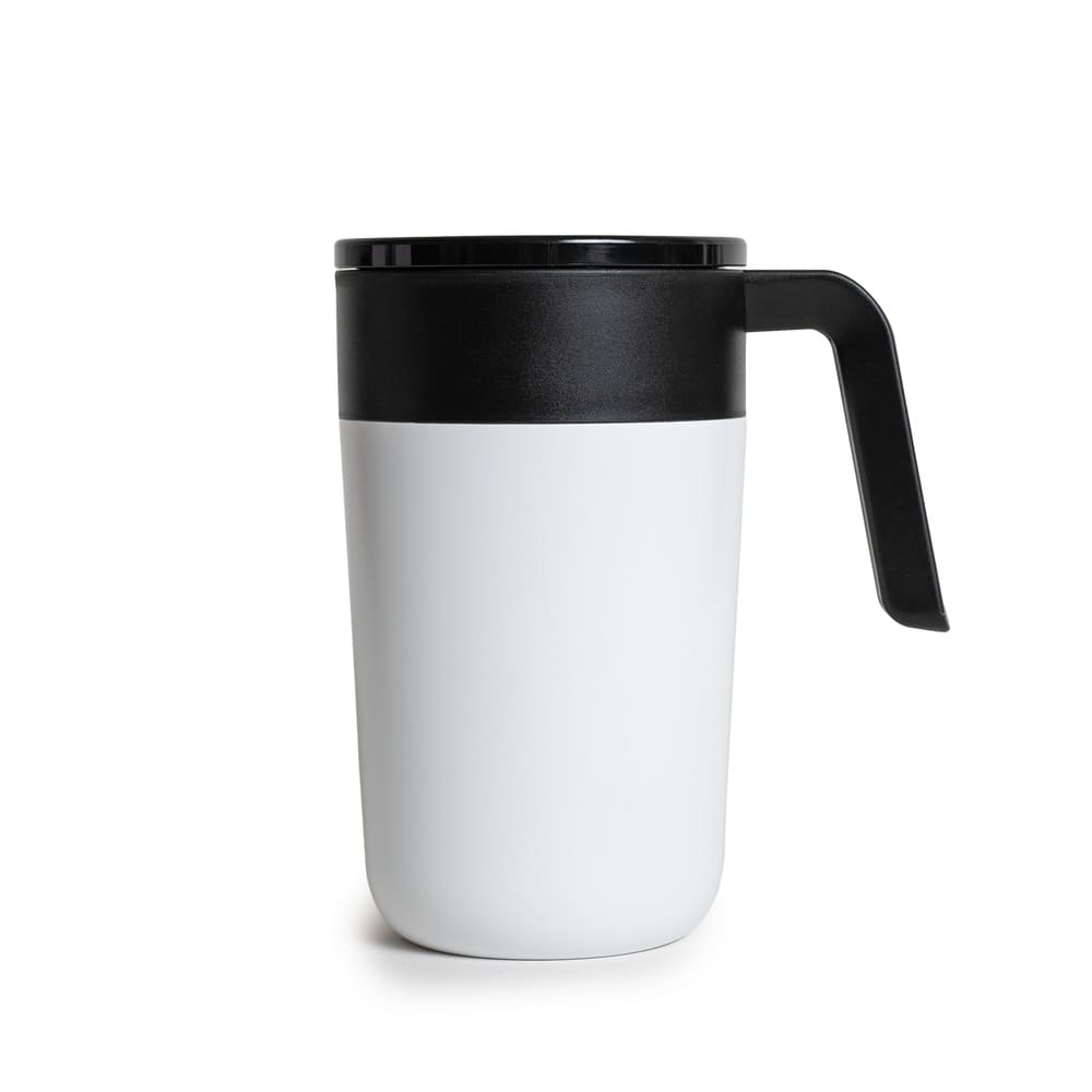 Mug doble pared. Interior de polipropileno y exterior de acero 201, acabado mate. Asa y tapa de polipropileno con anillo de silicona y seguro antiderrame. Base antideslizante. Caja contenedora de cartón blanco.