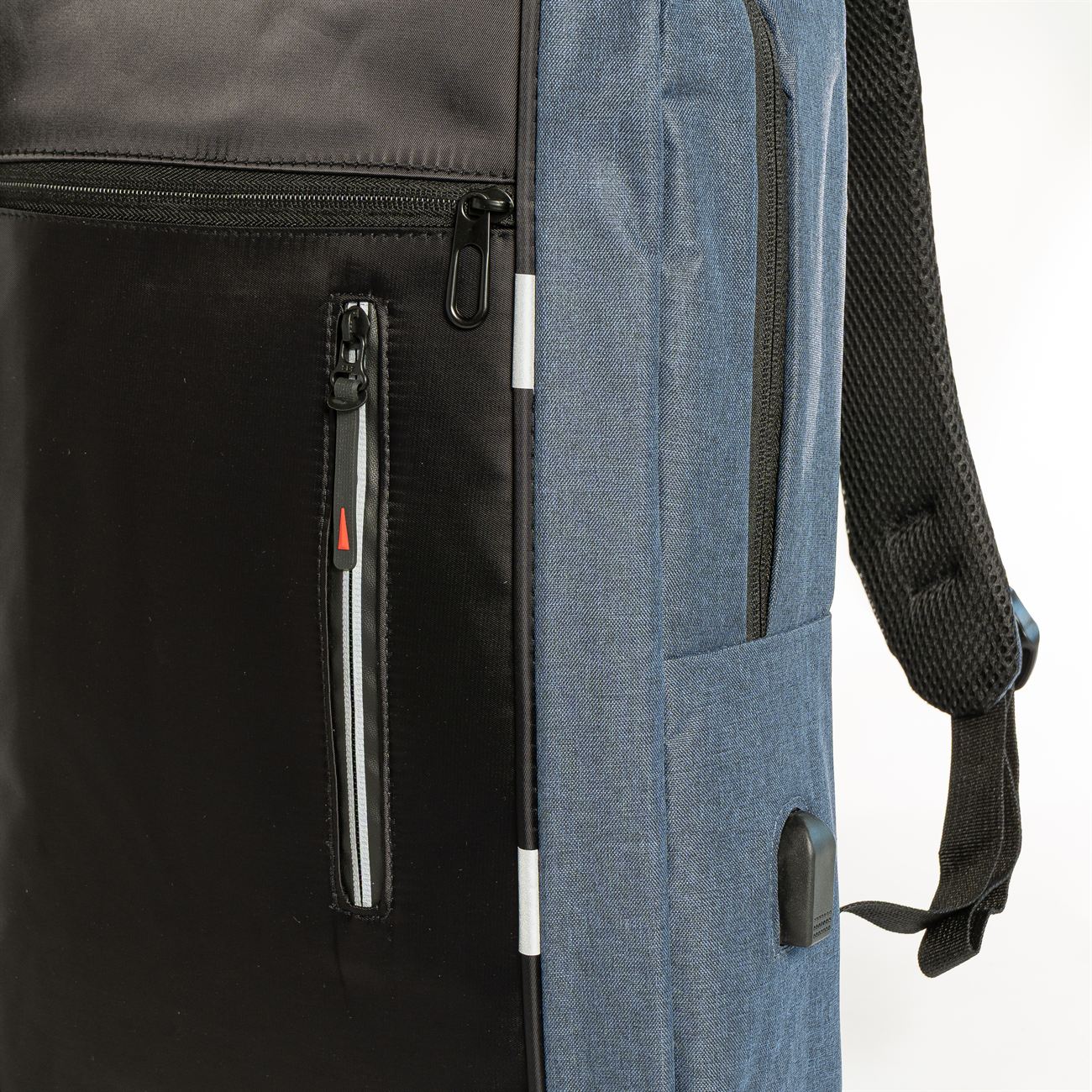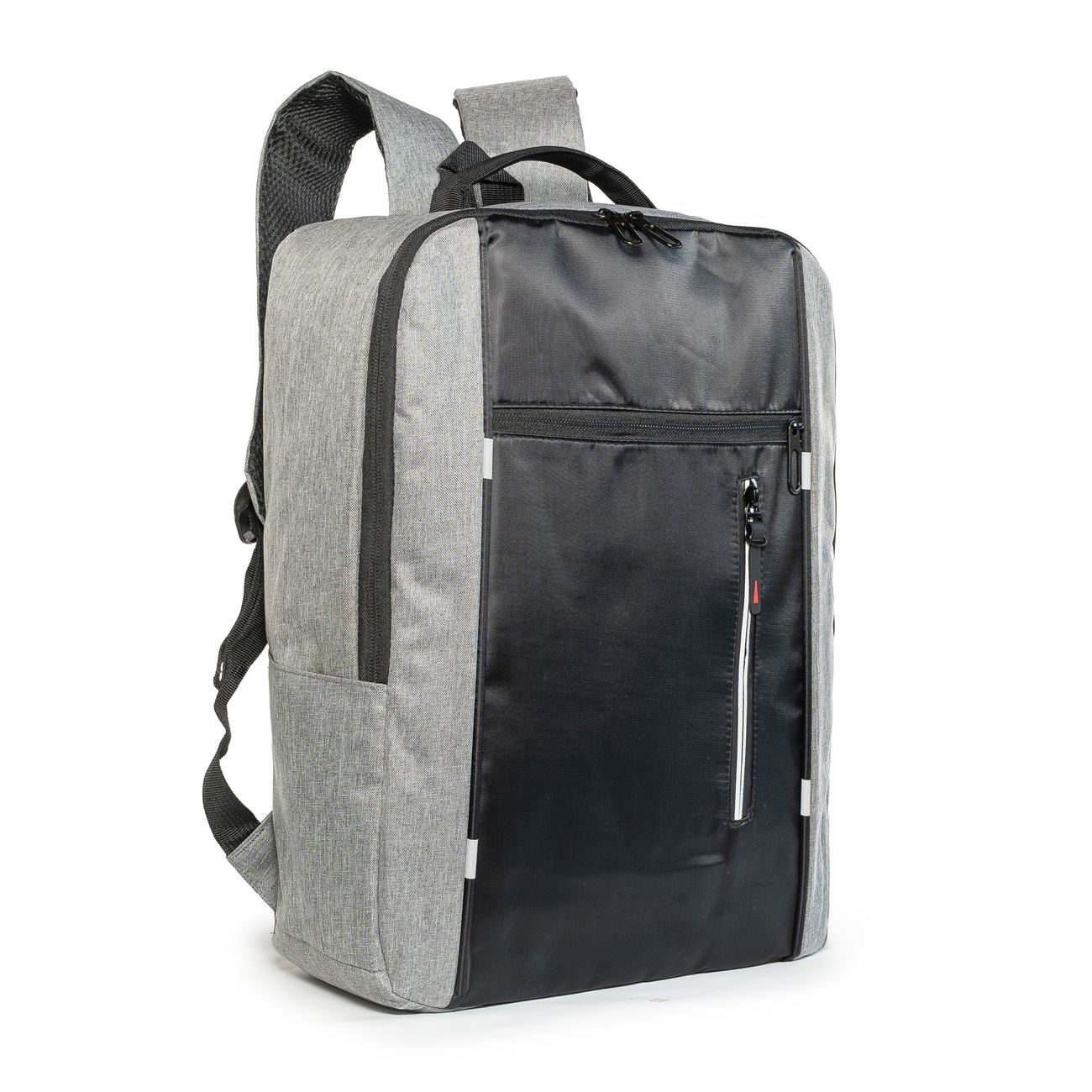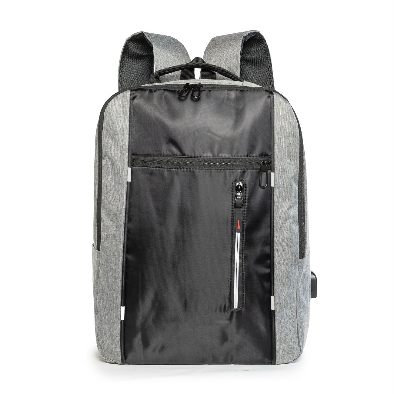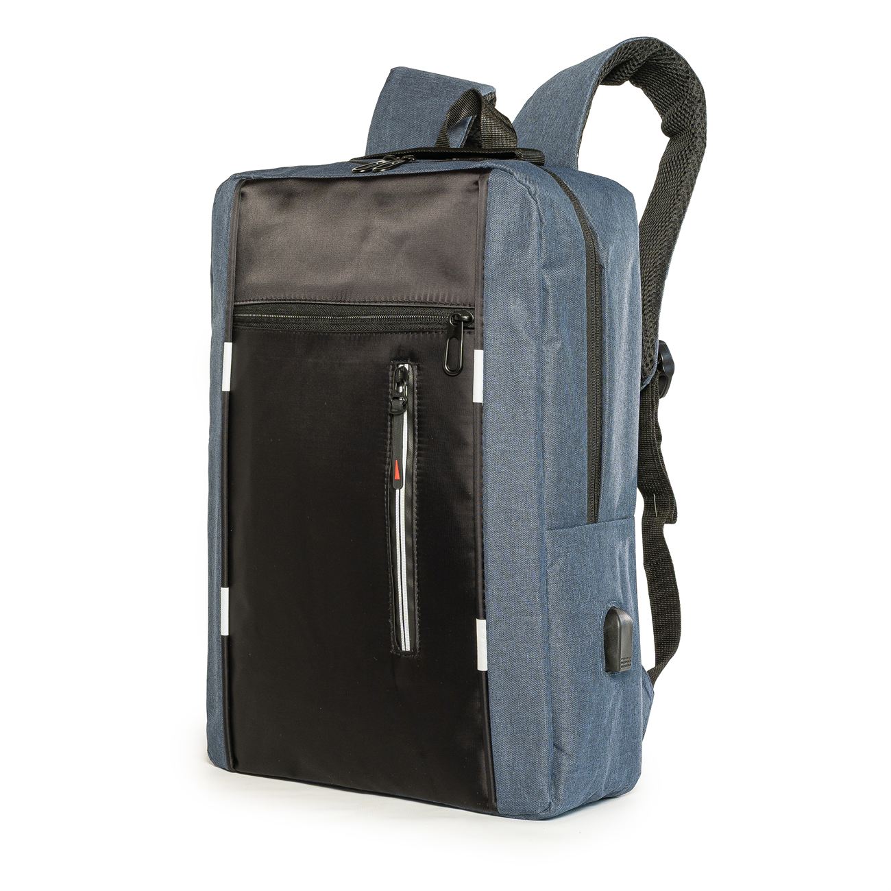 DESCRIPCIÓN: Mochila porta notebook. Presenta dos bolsillos en el frente con cierre, uno vertical con detalle reflectivo. Un compartimiento principal con cierre doble que contiene sobre el sector de la espalda el bolsillo porta notebook con sujetador con velcro con capacidad para introducir una notebook de hasta 17′. Hacia el frente dos bolsillos porta objetos y dos porta bolígrafo. Salida externa USB con cable para conexión interna. Bolsillo en un lateral. Manija de sujeción superior y gancho para colgar. Correas acolchadas ajustables.