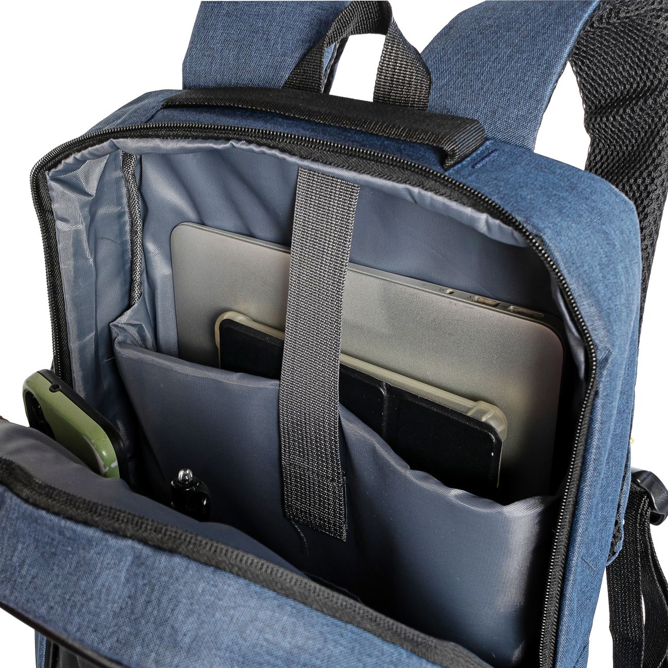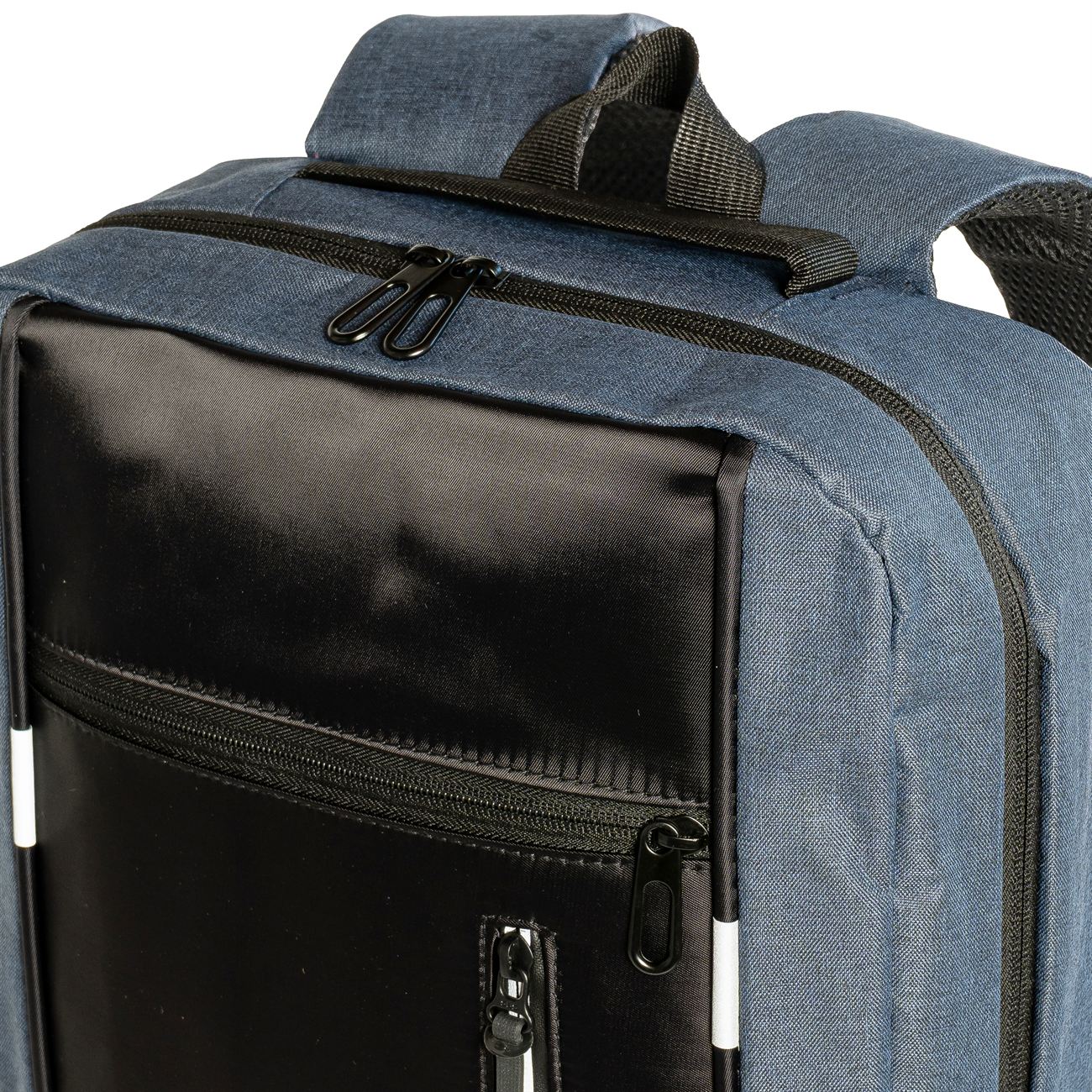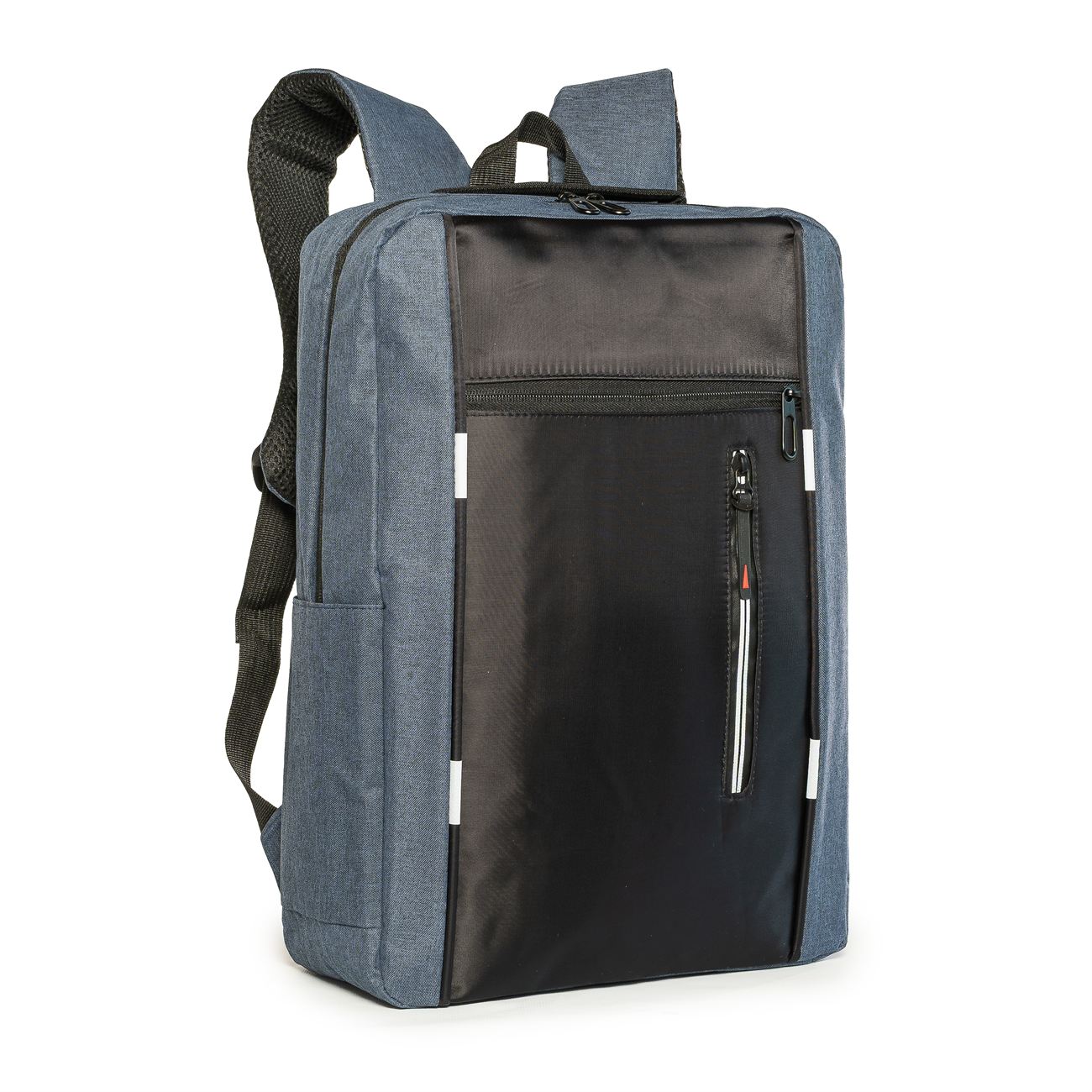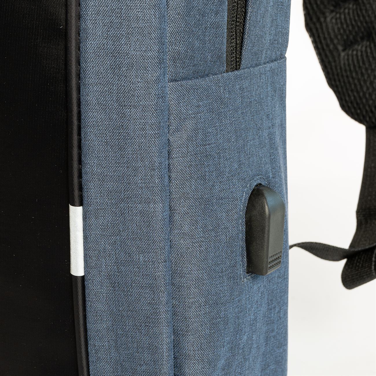 DESCRIPCIÓN: Mochila porta notebook. Presenta dos bolsillos en el frente con cierre, uno vertical con detalle reflectivo. Un compartimiento principal con cierre doble que contiene sobre el sector de la espalda el bolsillo porta notebook con sujetador con velcro con capacidad para introducir una notebook de hasta 17′. Hacia el frente dos bolsillos porta objetos y dos porta bolígrafo. Salida externa USB con cable para conexión interna. Bolsillo en un lateral. Manija de sujeción superior y gancho para colgar. Correas acolchadas ajustables.