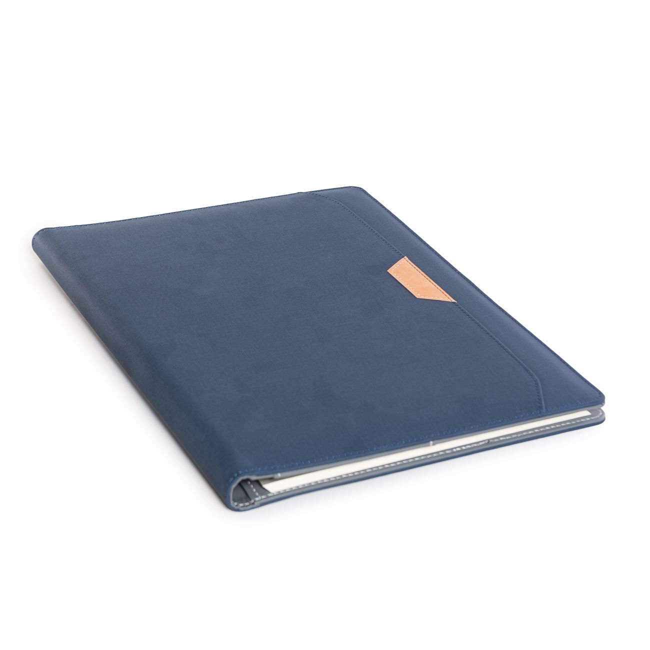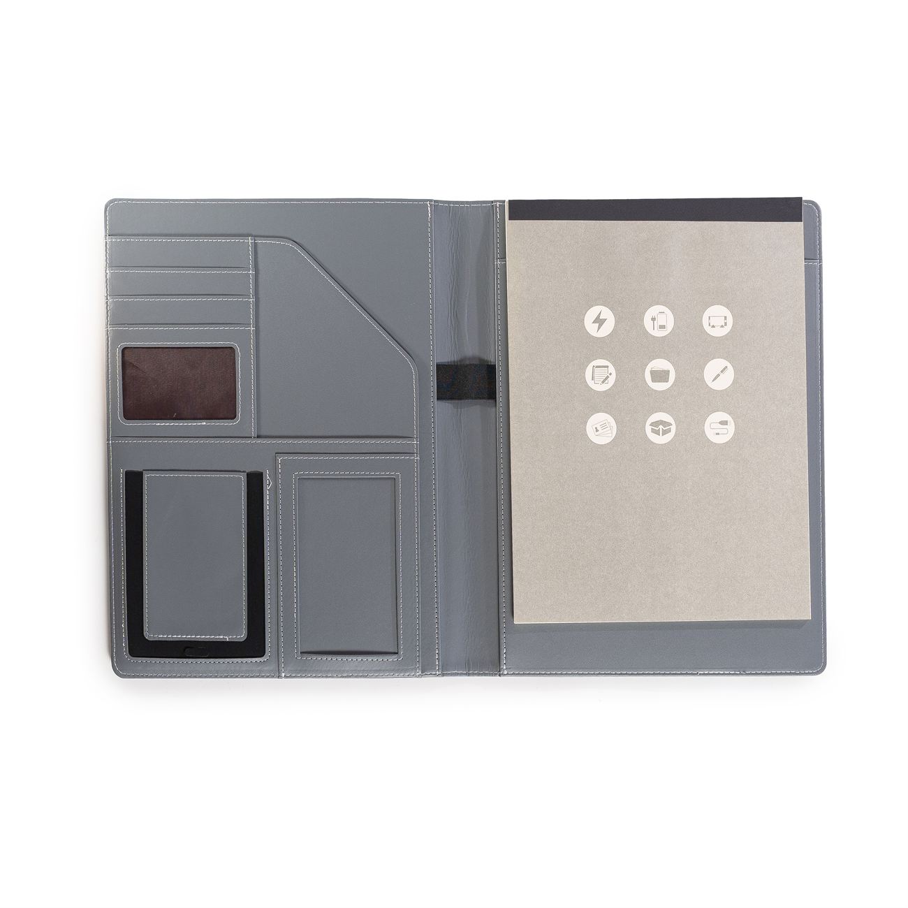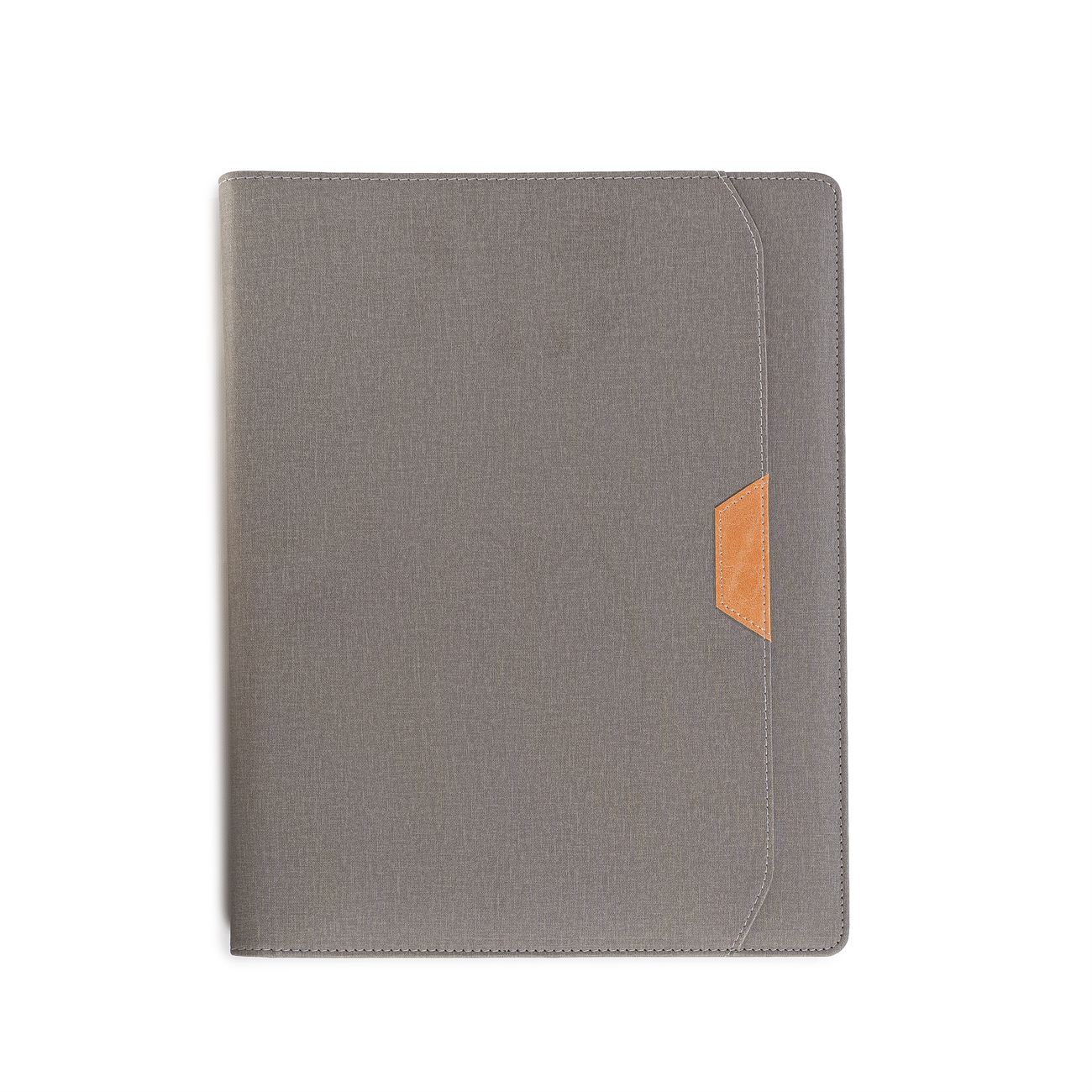 Protfolio en PU simil gabardina. Frente con un bolsillo con detalle en simil cuero. En su interior, solapa para papeles, y sobre ella diversos porta tarjetas, bolsillo principal y dos al frente (uno elastizado). Porta bolígrafo central y block de 30 hojas rayadas.