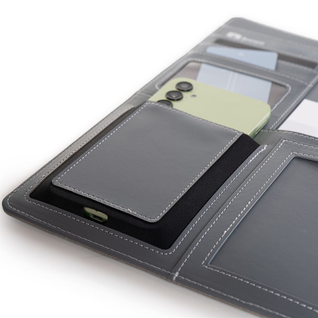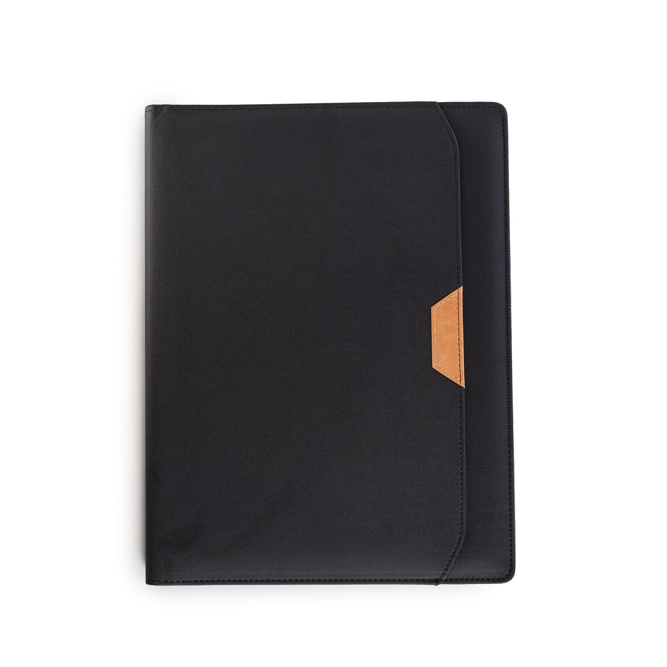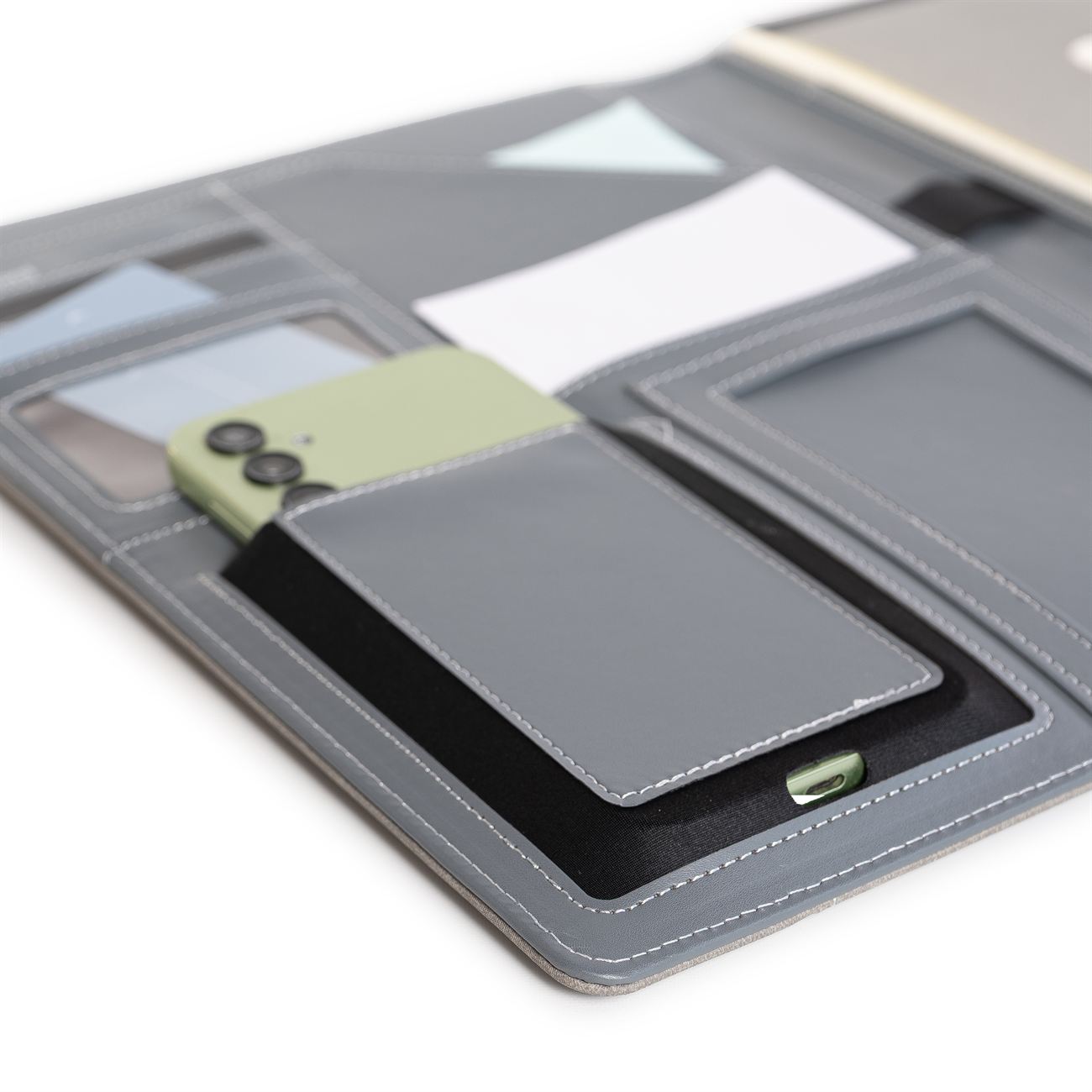Protfolio en PU simil gabardina. Frente con un bolsillo con detalle en simil cuero. En su interior, solapa para papeles, y sobre ella diversos porta tarjetas, bolsillo principal y dos al frente (uno elastizado). Porta bolígrafo central y block de 30 hojas rayadas.