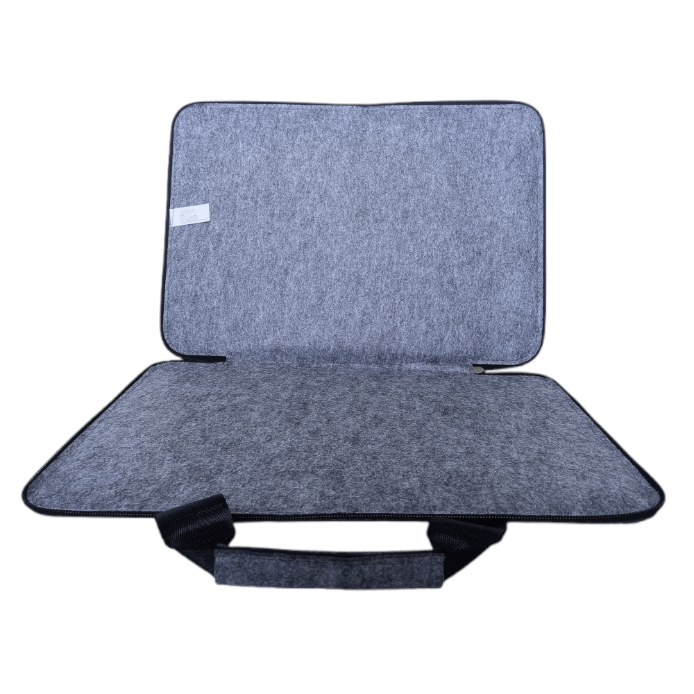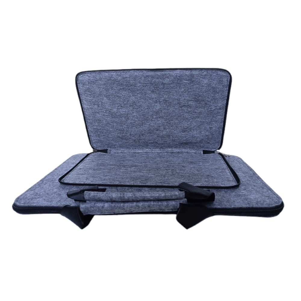 Fabricado con fieltro ecológico. Al frente posee un bolsillo con cierre doble de 31cm de ancho por 20 cm de alto. El maletin tiene 40 cm de ancho por 28 cm de alto con cierre doble. Capacidad para notebook de 17′. Manijas de cordura reforzadas con fieltro.