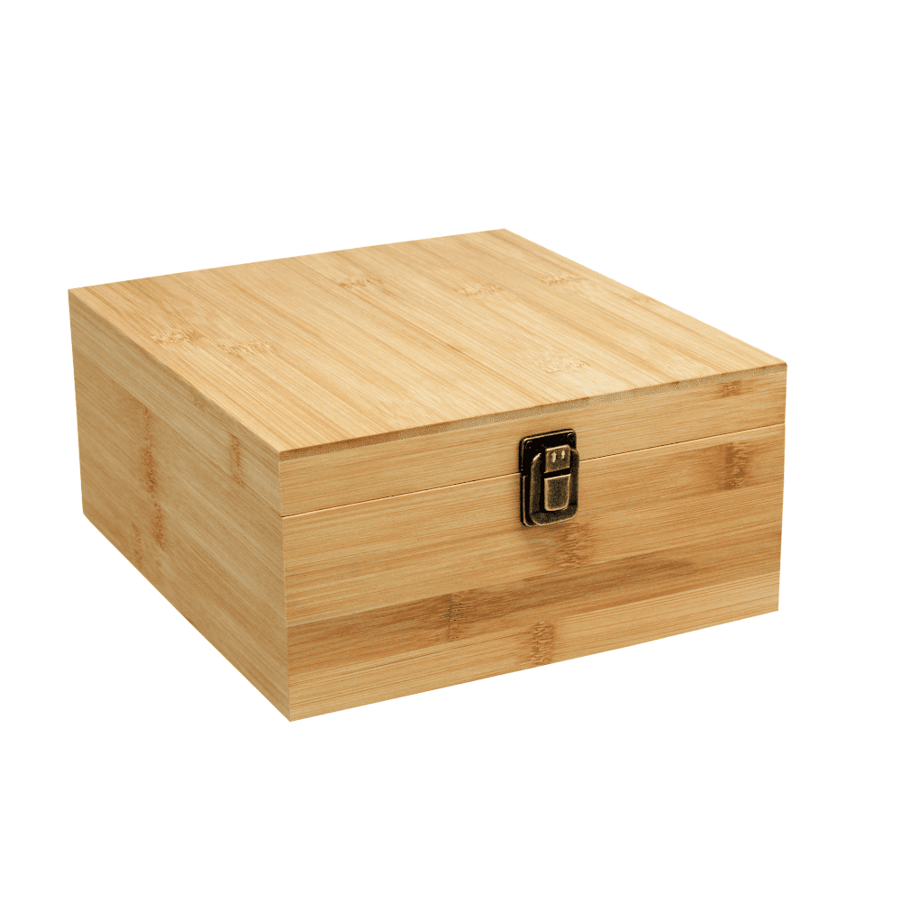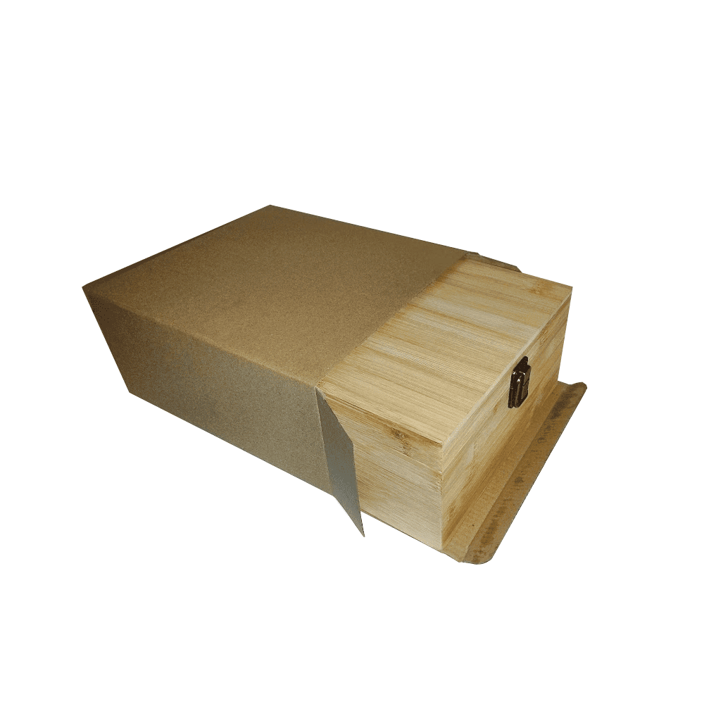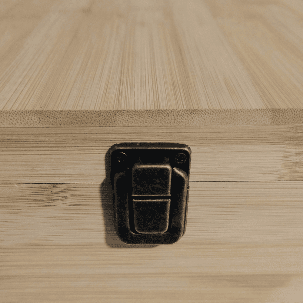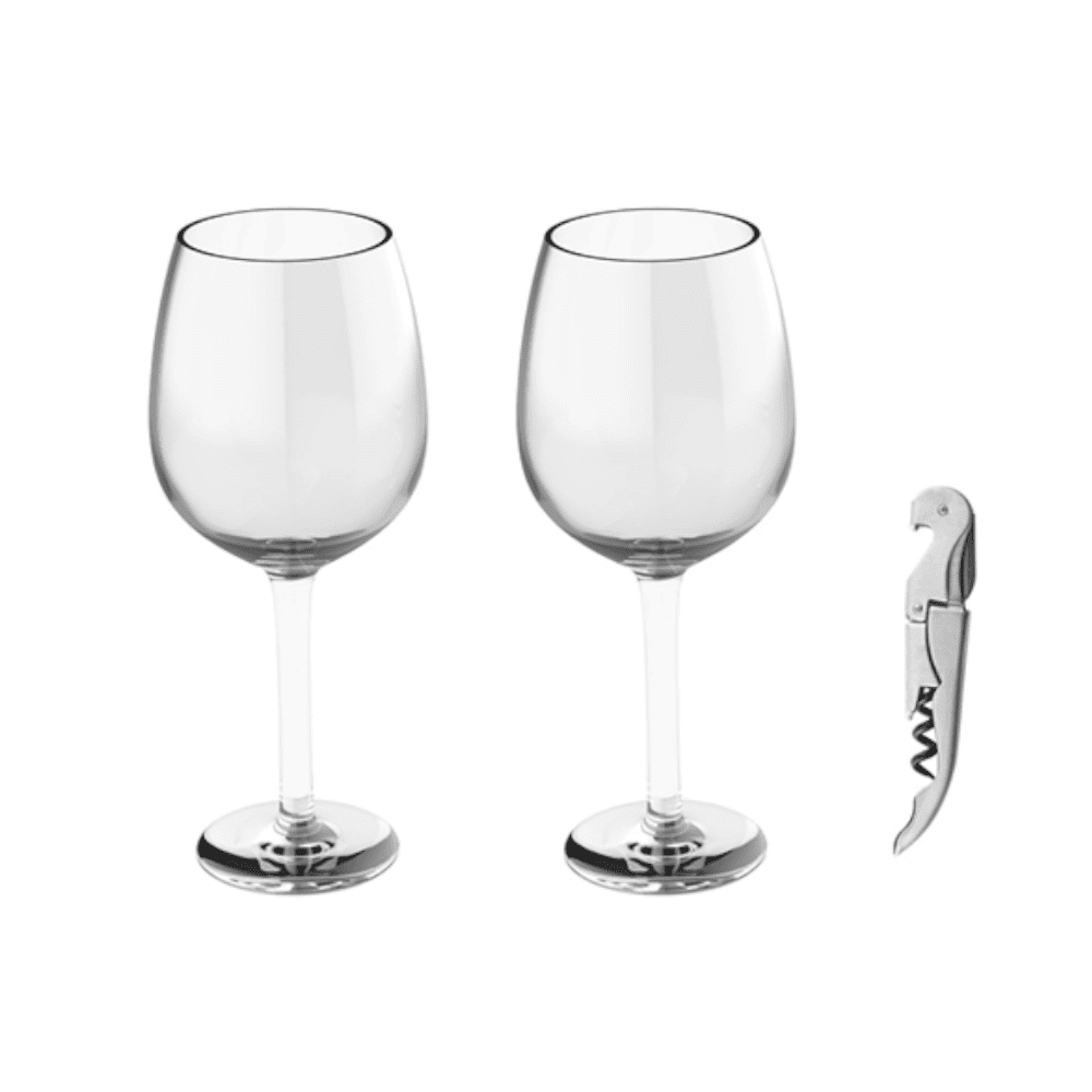 Set de vino en caja de bambú con herrajes metálicos. En su interior trae dos copas de vino y un destapador metálico de dos tiempos de acero inoxidable. Incluye espuma protectora donde encajan las piezas para su guardado y traslado.