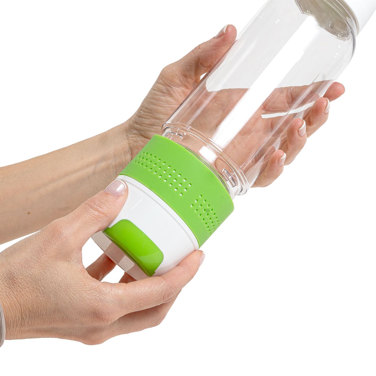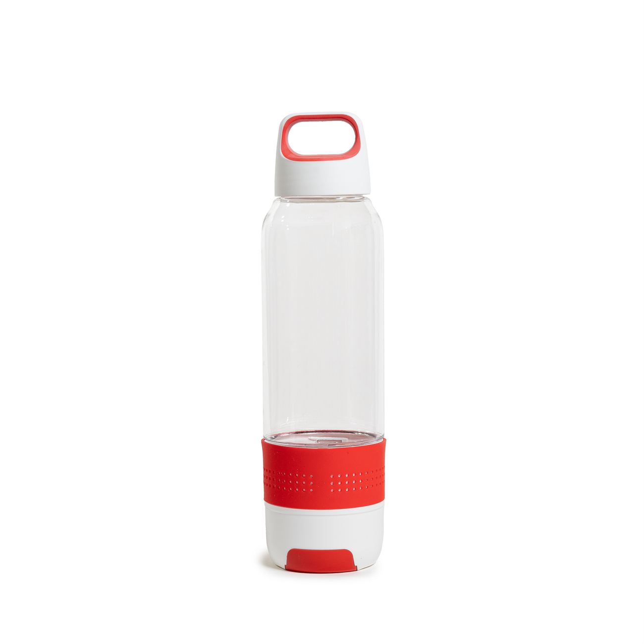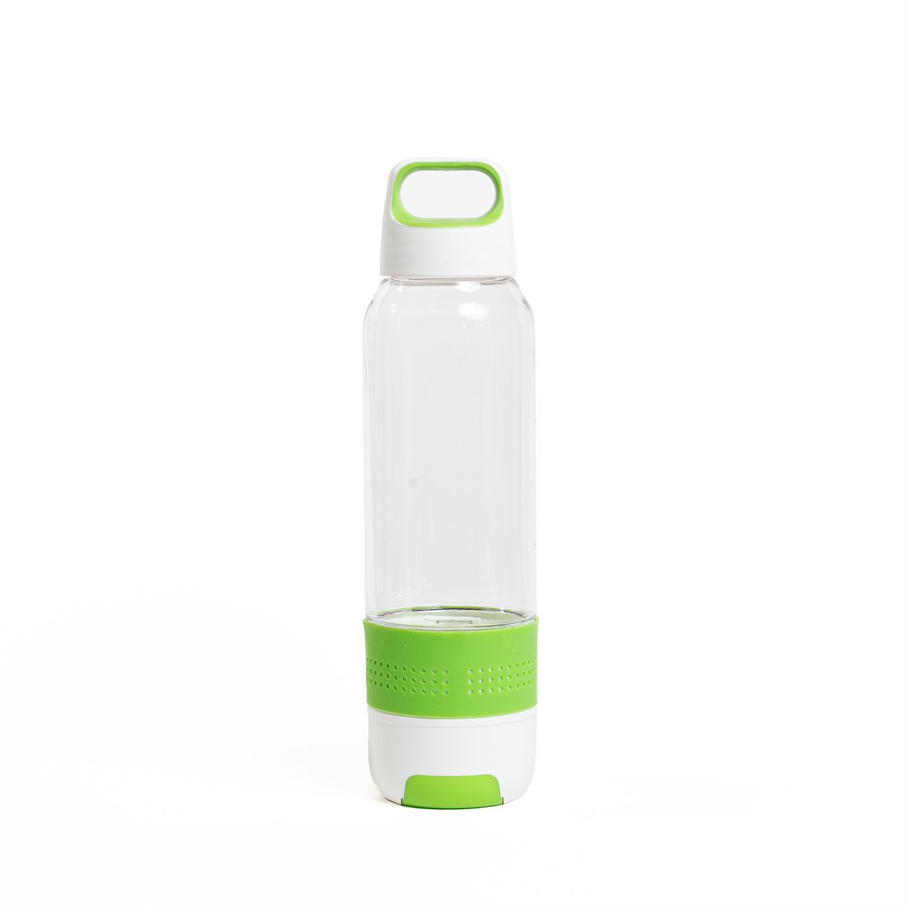 Descripción: Botella deportiva de copoliester cristal con tapa a rosca, vaso inferior y agarradera de PVC color blanco, con arandela hermetizante, decoración exterior de color en silicona en cuerpo y tapa.