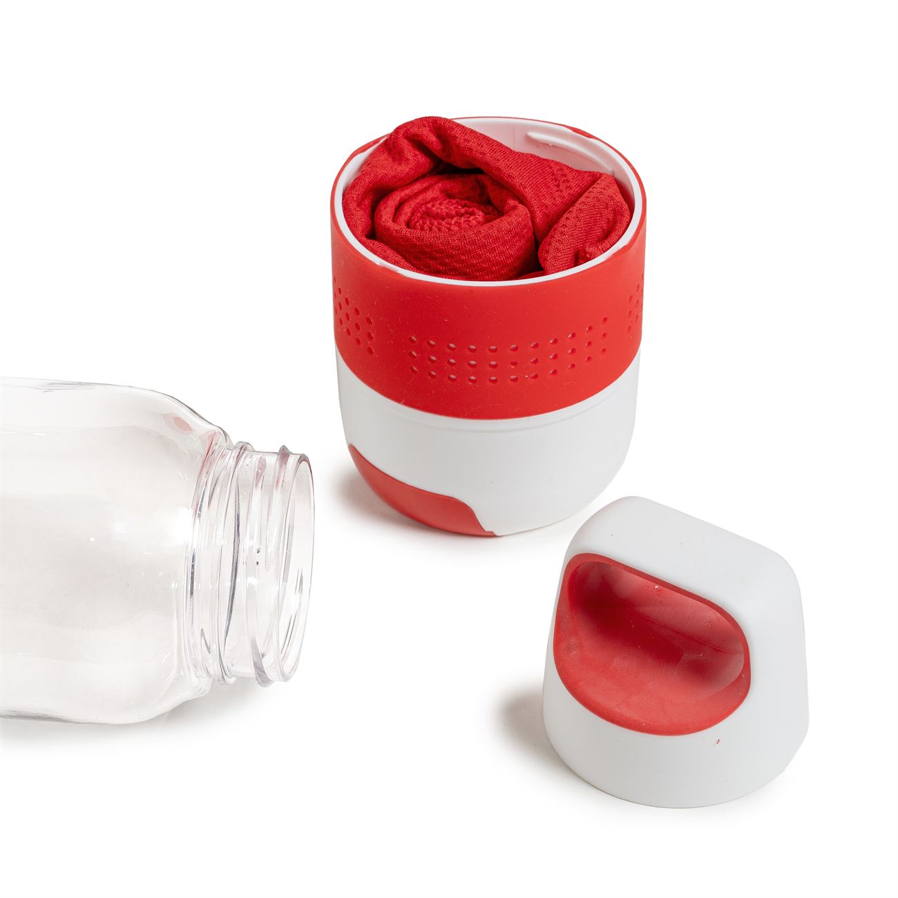 Dentro del vaso inferior provee una toalla de microfibra de 80cm x 20cm. En la base del vaso inferior posee una bandeja deslizable para soporte del celular.