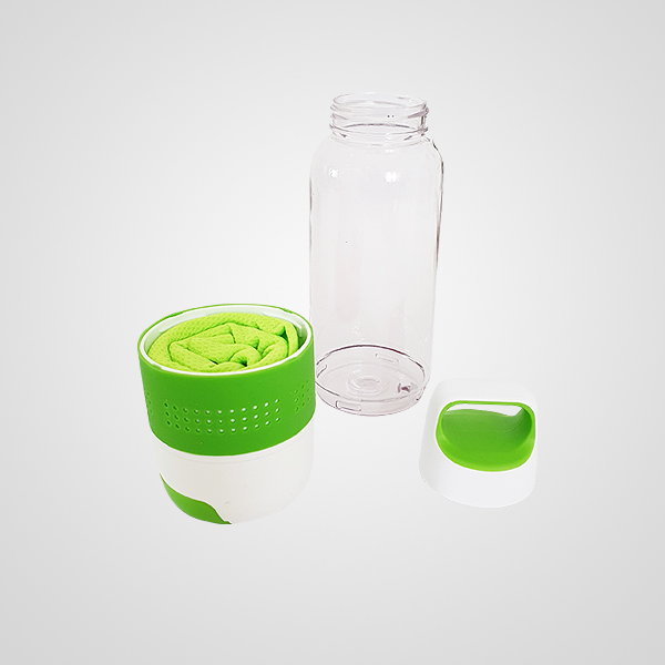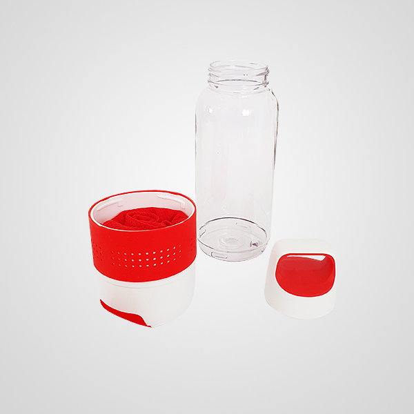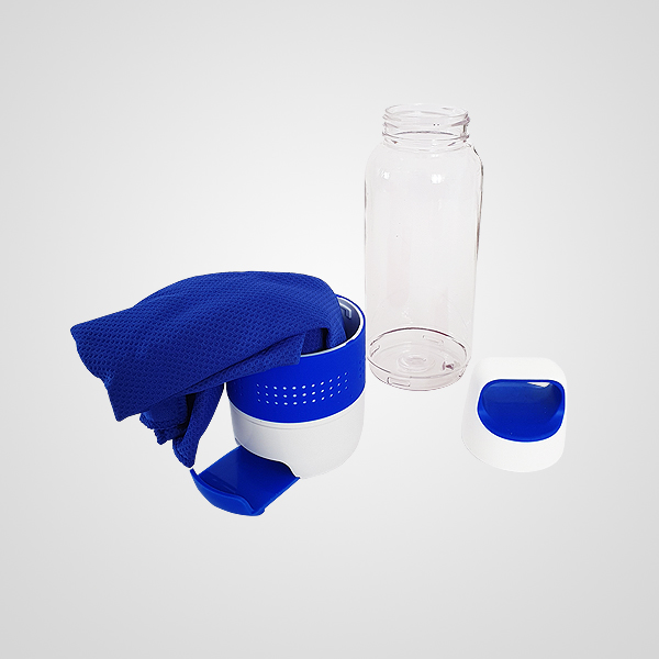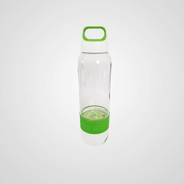 Descripción: Botella deportiva de copoliester cristal con tapa a rosca, vaso inferior y agarradera de PVC color blanco, con arandela hermetizante, decoración exterior de color en silicona en cuerpo y tapa.