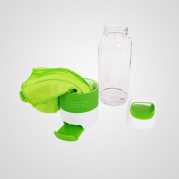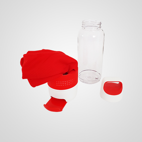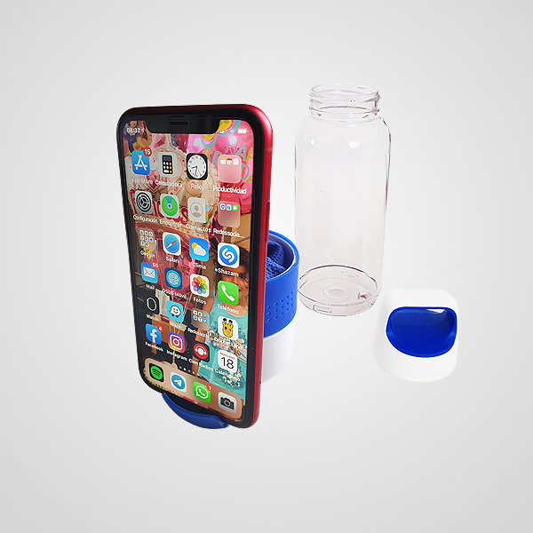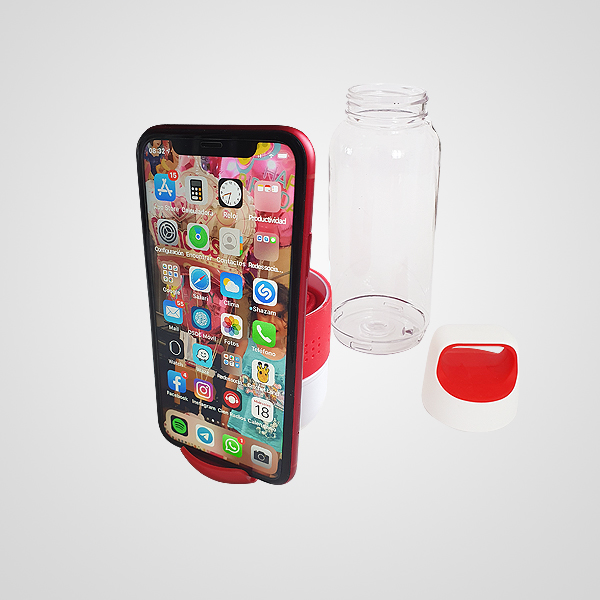 Dentro del vaso inferior provee una toalla de microfibra de 80cm x 20cm. En la base del vaso inferior posee una bandeja deslizable para soporte del celular.