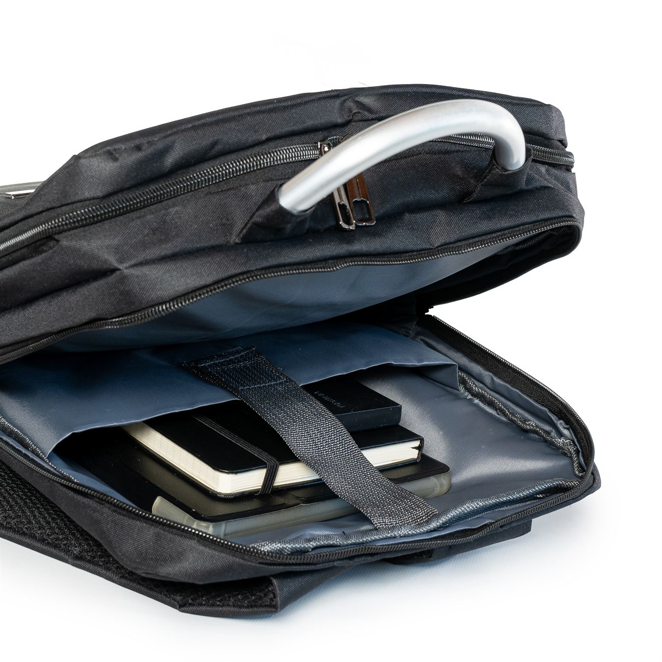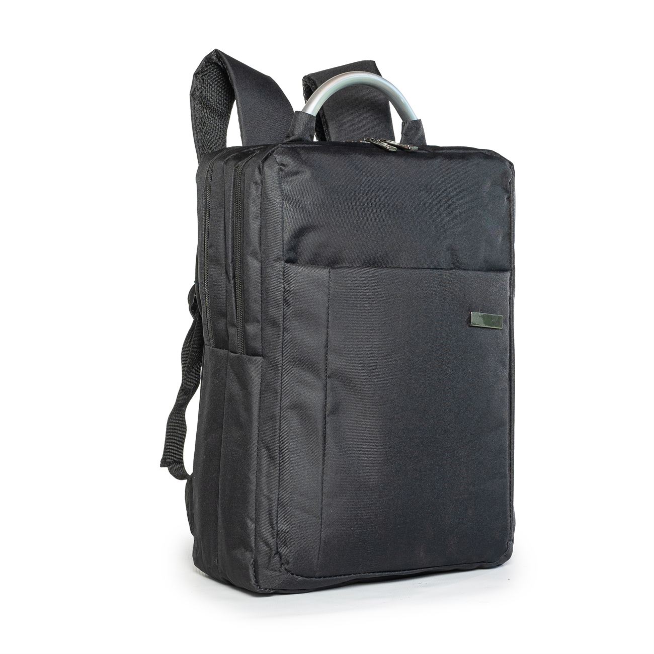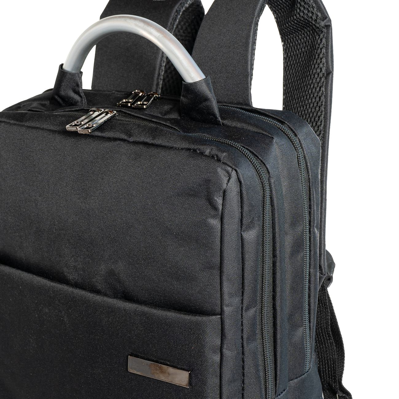 DESCRIPCIÓN: Presenta un bolsillo en el frente con cierre oculto y chapa en su lateral de 5cm x 1cm para poder grabar una inscripción. Luego dos compartimientos, el primero con un cierre doble, el segundo y principal, también con cierre doble que contiene sobre el sector de la espalda el bolsillo porta notebook con sujetador con velcro con capacidad para introducir una notebook de hasta 17″.