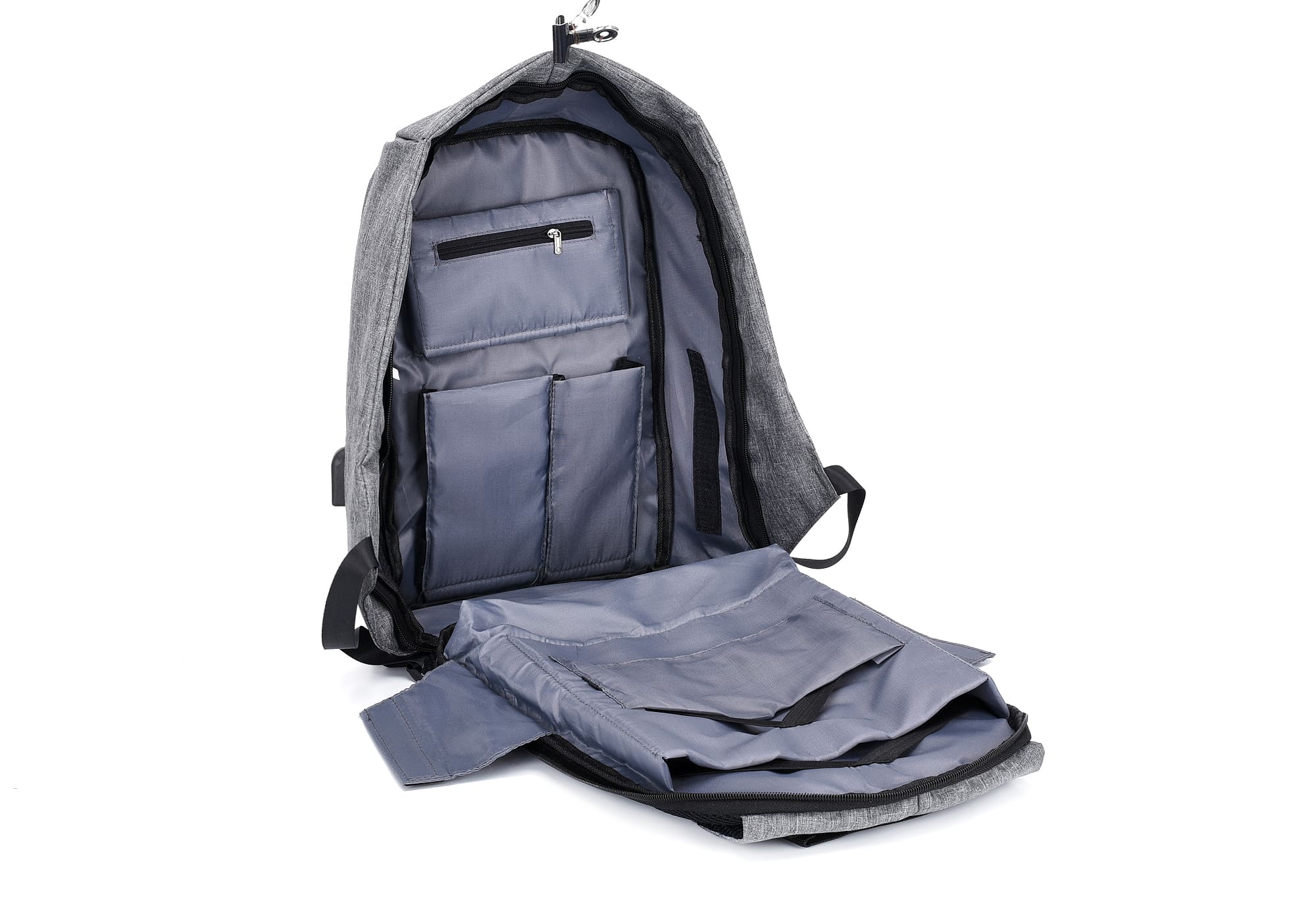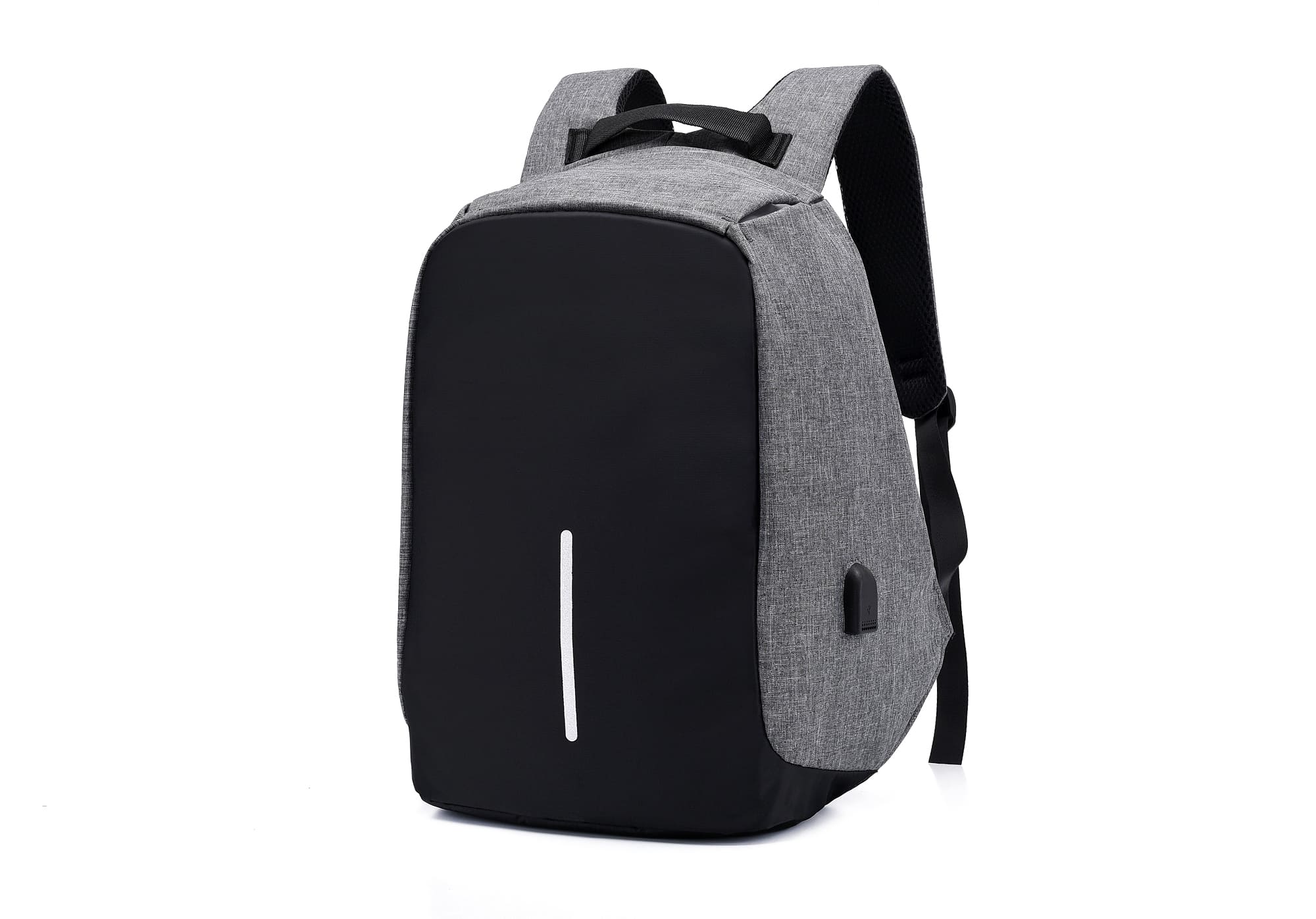 DESCRIPCIÓN: Mochila porta notebook con cierre oculto. Presenta el frente negro acolchado con detalle refractario. El compartimiento con un cierre doble que contiene sobre el sector de la espalda dos bolsillos, uno porta notebook (hasta 17 pulgadas) y otro más pequeño con sujetadores elásticos. Hacia el frente trae tres bolsillos porta objetos, el más grande posee un cierre frontal a modo de bolsillo. El interior forrado y acolchado. Salida externa USB con cable para conexión interna. Respaldar acolchado y reforzado con rip. Manija de sujeción superior reforzada. Correas acolchadas ajustables, en una de ellas otro sobre con cierre para objetos pequeños