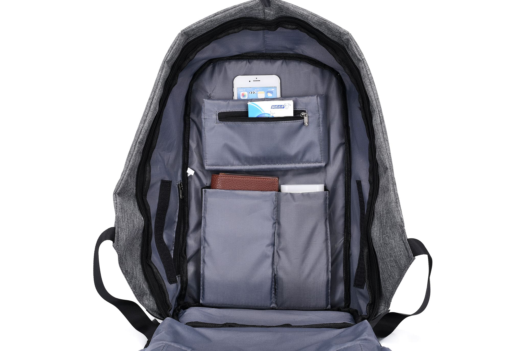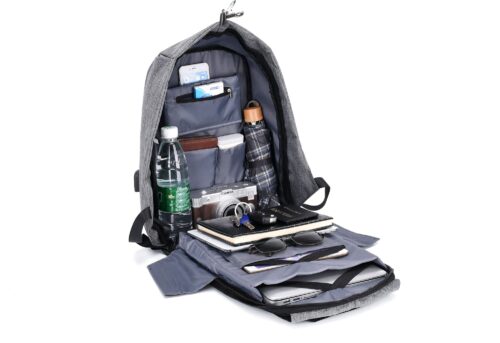DESCRIPCIÓN: Mochila porta notebook con cierre oculto. Presenta el frente negro acolchado con detalle refractario. El compartimiento con un cierre doble que contiene sobre el sector de la espalda dos bolsillos, uno porta notebook (hasta 17 pulgadas) y otro más pequeño con sujetadores elásticos. Hacia el frente trae tres bolsillos porta objetos, el más grande posee un cierre frontal a modo de bolsillo. El interior forrado y acolchado. Salida externa USB con cable para conexión interna. Respaldar acolchado y reforzado con rip. Manija de sujeción superior reforzada. Correas acolchadas ajustables, en una de ellas otro sobre con cierre para objetos pequeños