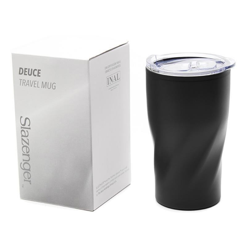Jarro térmico Deuce de Slazenger realizado en acero inoxidable en su exterior, y polipropileno de color negro en su interior, con tapa cristal clear. Producto aprobado por el I.N.A.L. para el contacto con alimentos.
