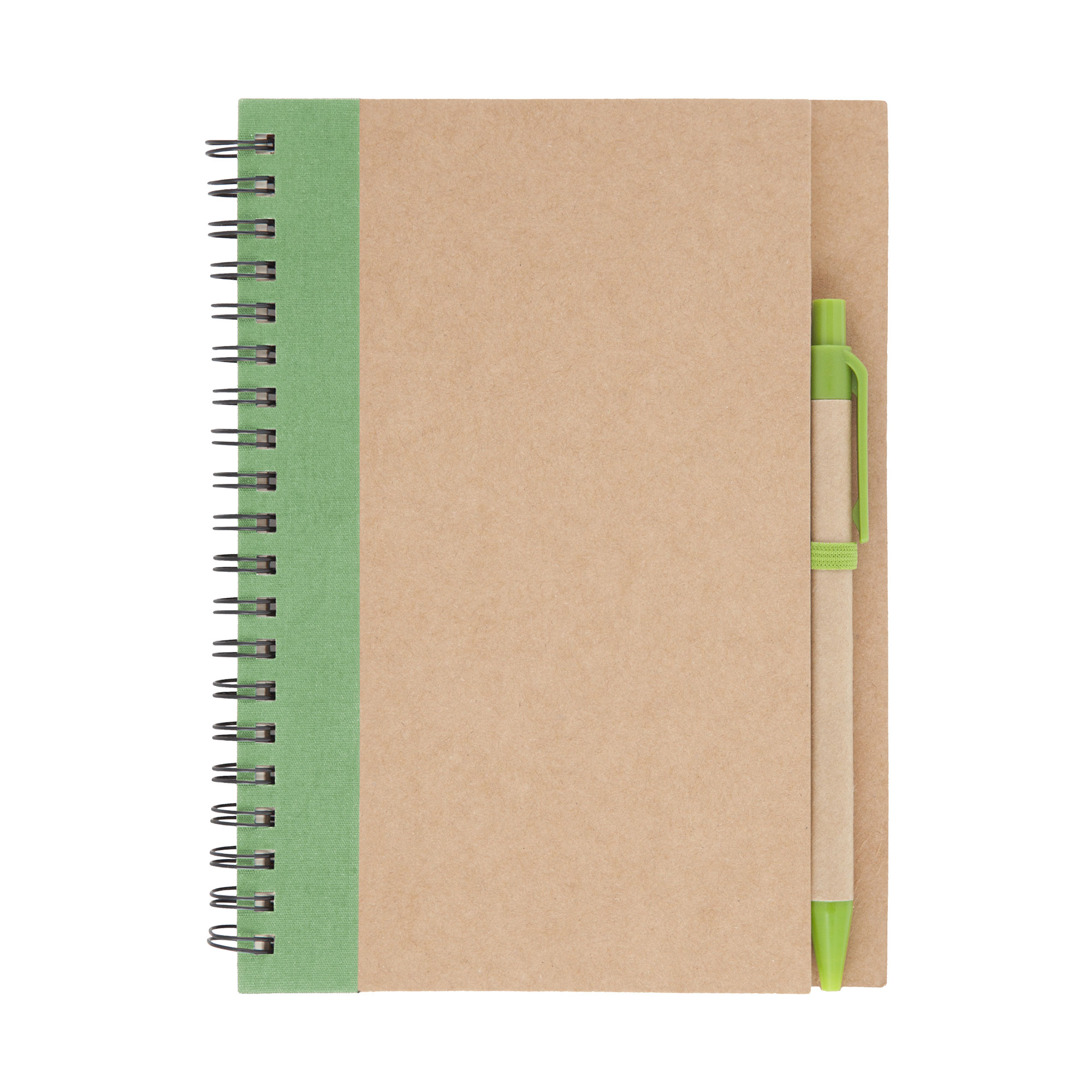 13,8 x 18 x 1,5 cm Elaborada con papel reciclado. Incluye bolígrafo biodegradable. Espiralado. Contiene 70 hojas lisas.