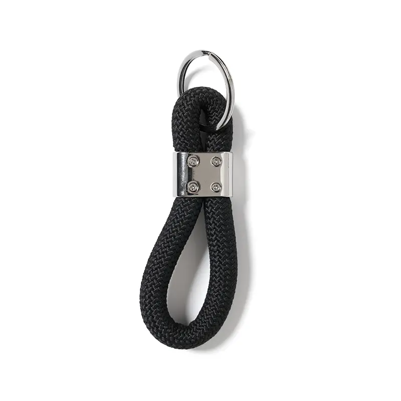 Llavero con diseño en forma de lazo, elaborado en cuerda resistente con terminaciones metálicas en satinado plateado. Hecho para brindar durabilidad y estética, cuenta con anillo de metal para sujeción segura y estilo minimalista. Es ideal para regalos promocionales o uso personal y para acompañar las llaves con un toque distintivo, práctico y moderno.