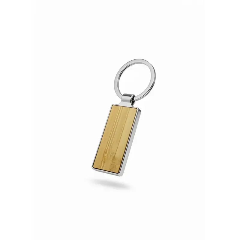 Llavero metálico con cara de bambú. Fabricado en aleación de zinc y bambú en color natural. Cuenta con anilla duradera y diseño alargado y minimalista. Es ideal para merchandising ecológico, campañas publicitarias y uso diario.